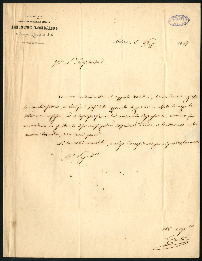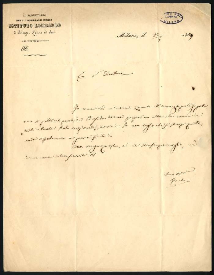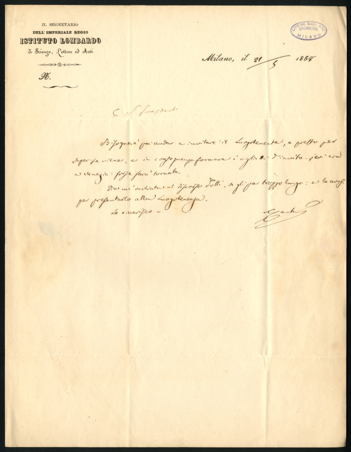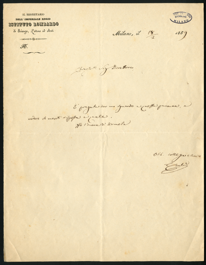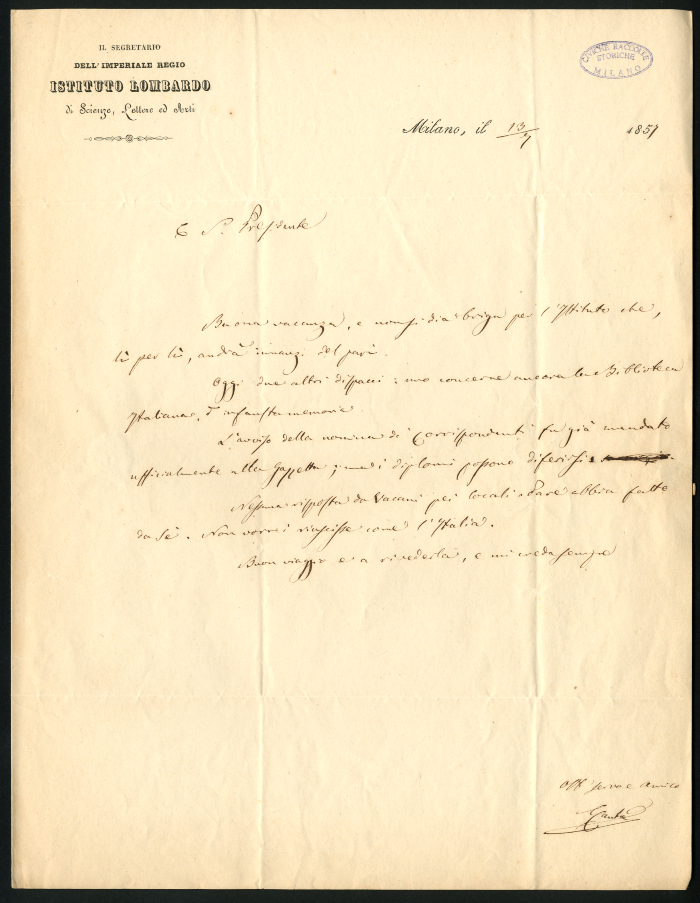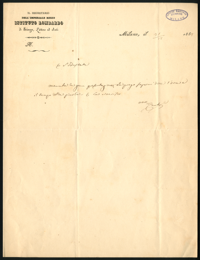 11) Carta intestata "Il segretario / dell'Imperiale regio / Istituto lombardo / di scienze, lettere ed arti". Non sono presenti allegati.
