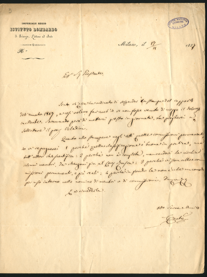 3) Milano, 17 aprile 1857: Afferma che "il doloroso incidente" gli ha impedito di eseguire l'ordine di Verga di sospendere la stampa del rapporto del 1857 ma, desiderando procedere in giornata, prega Verga di sollecitare il prof. Veladini. Sconsiglia, fornendo le proprie motivazioni, la stampa negli «Atti [dell'I.R. Istituto lombardo di scienze, lettere ed arti]» delle Commissioni permanenti.