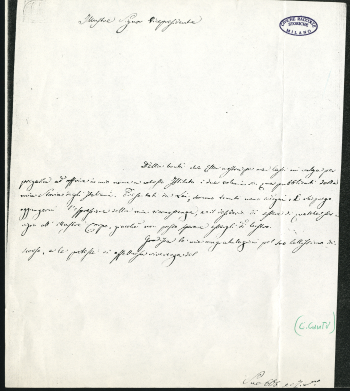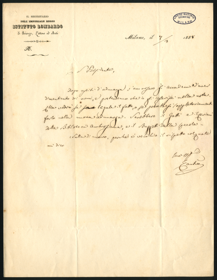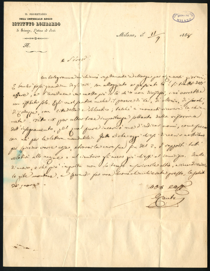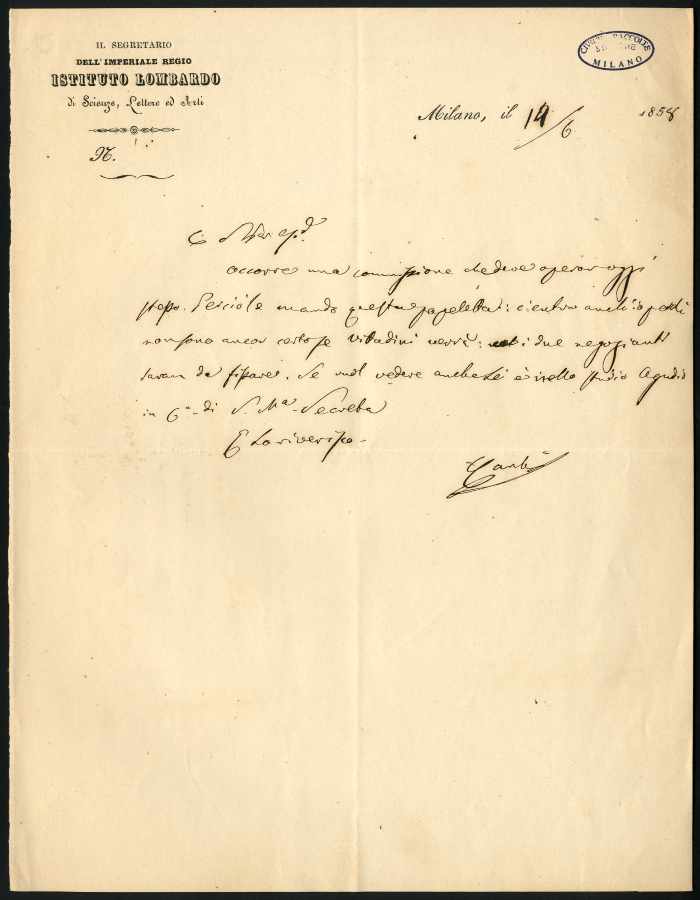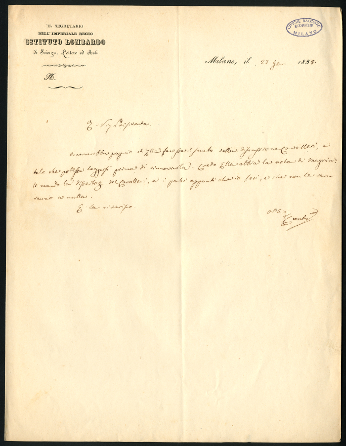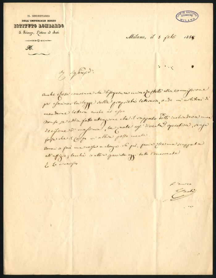 12) Carta intestata "Il segretario / dell'Imperiale regio / Istituto lombardo / di scienze, lettere ed arti". Sottoscrizione "L'amico Cantù".