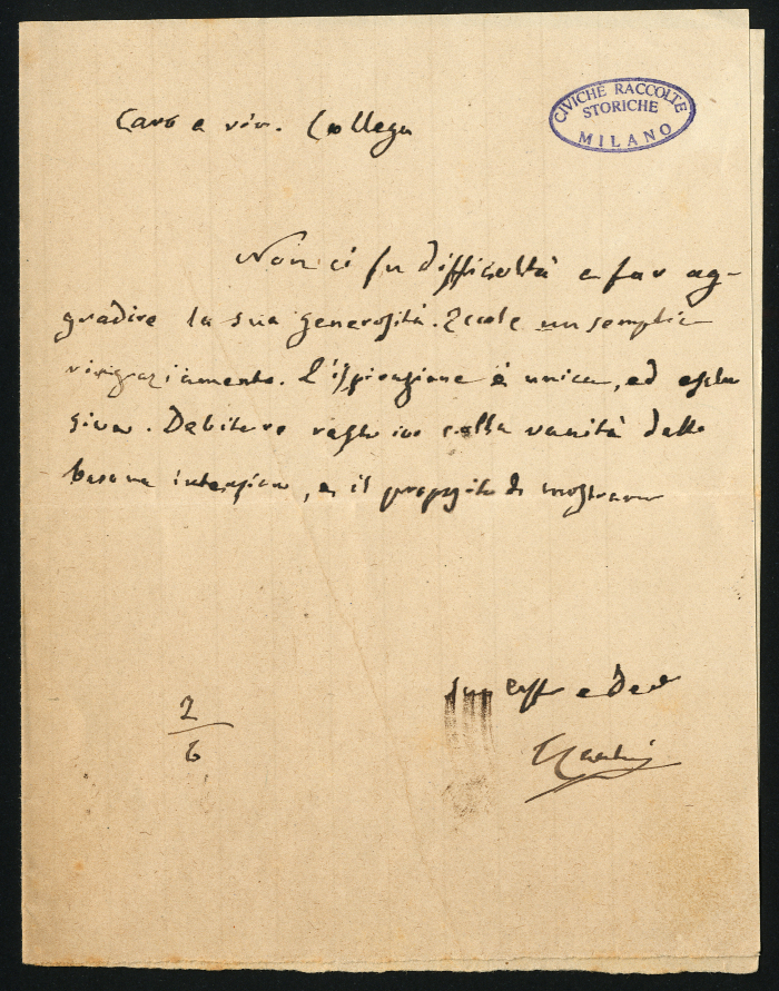2) [Milano], 2 febbraio [1857]: Ha letto sulla «Gazzetta» della propria nomina a segretario [dell'Istituto lombardo], che non ha cercato e alla quale vorrebbe rinunciare. Preannuncia a Verga che gli farà visita l'indomani per chiedergli consiglio e si congratula per la sua contestuale nomina.