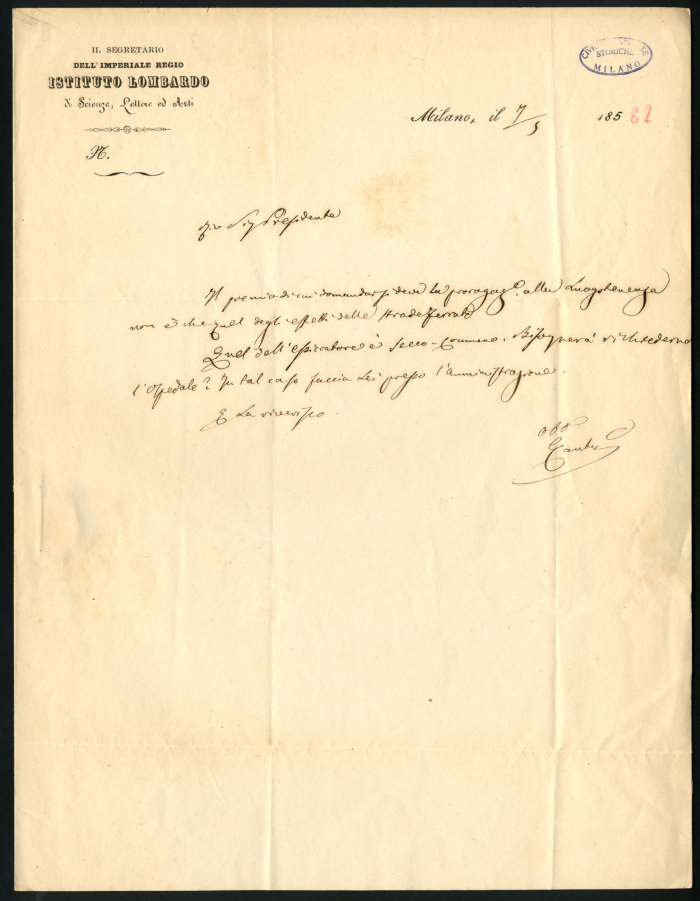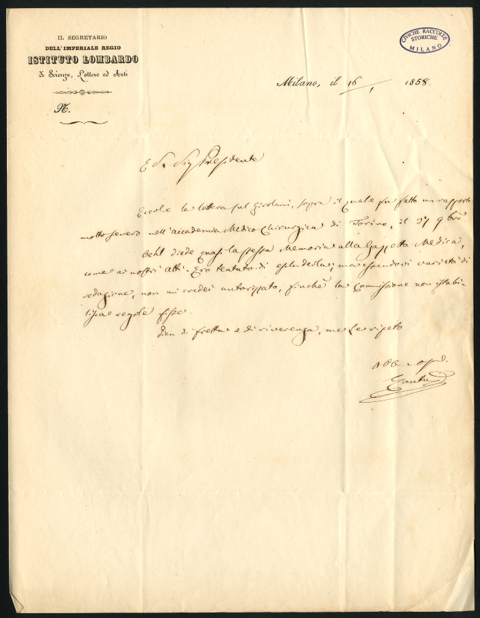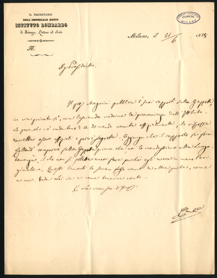 20) Milano, 21 giugno 1858: Chiede a Verga di valutare il caso del prof. Magrini che pubblica in via privata i suoi rapporti sulla «Gazzetta [medica]», mostrandone la provenienza dall'Istituto lombardo; aggiunge che il rapporto sui forni Rolland fu pubblicato sulla «Gazzetta» prima che loro lo mandassero alla Luogotenenza.