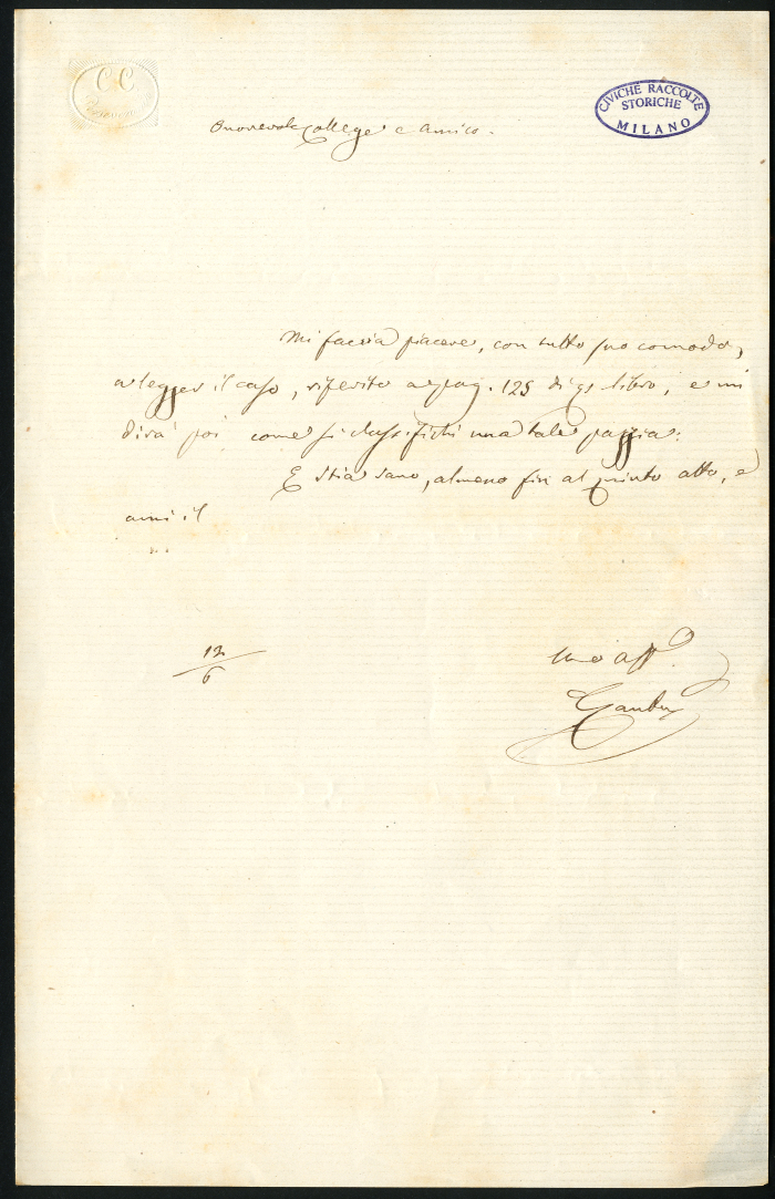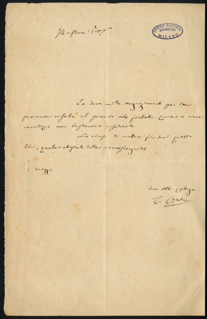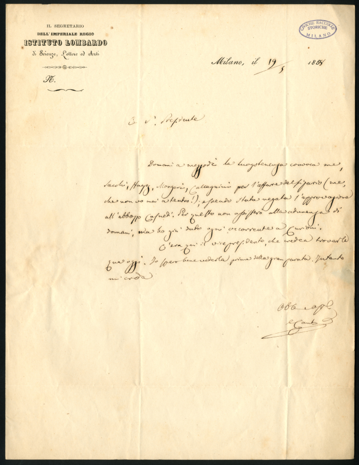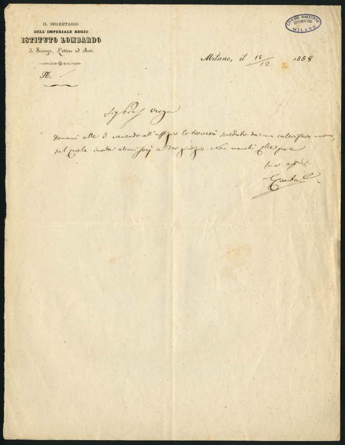 17) Milano, 19 maggio 1858: Comunica a Verga che l'indomani non potrà essere presente all'adunanza, perché la Luogotenenza lo ha convocato insieme a Sacchi, Hayez, Mongeri e Callagnini "per l'affare del sipario", poiché non è stato approvato l'abbozzo Casnedi. Aggiunge che ha istruito il collega Curioni sull'occorrente e che il Vicepresidente [Vacani] è passato sperando di incontrare Verga.