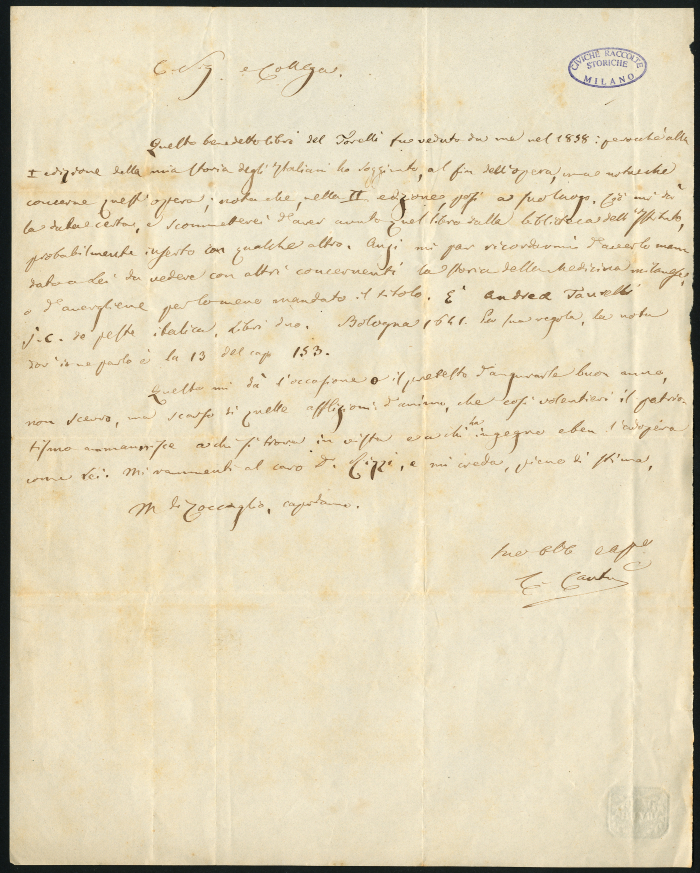 46) [s.l.], 1 gennaio [post 1858]: Informa Verga di aver visto il libro di Andrea Torelli ("De peste italica. Libri duo", Bologna, 1641) nel 1858, più o meno nel periodo della prima edizione della sua opera "Storia degli italiani". Si dichiara anche certo di aver avuto il libro dalla biblioteca dell'Istituto ed è quasi sicuro di averlo fatto avere a Verga insieme ad altri volumi di storia della medicina milanese; indica inoltre il punto del proprio libro nel quale cita l'opera di Torelli. In chiusura augura un buon anno a Verga e prega di ricordarlo al dottor Rizzi.