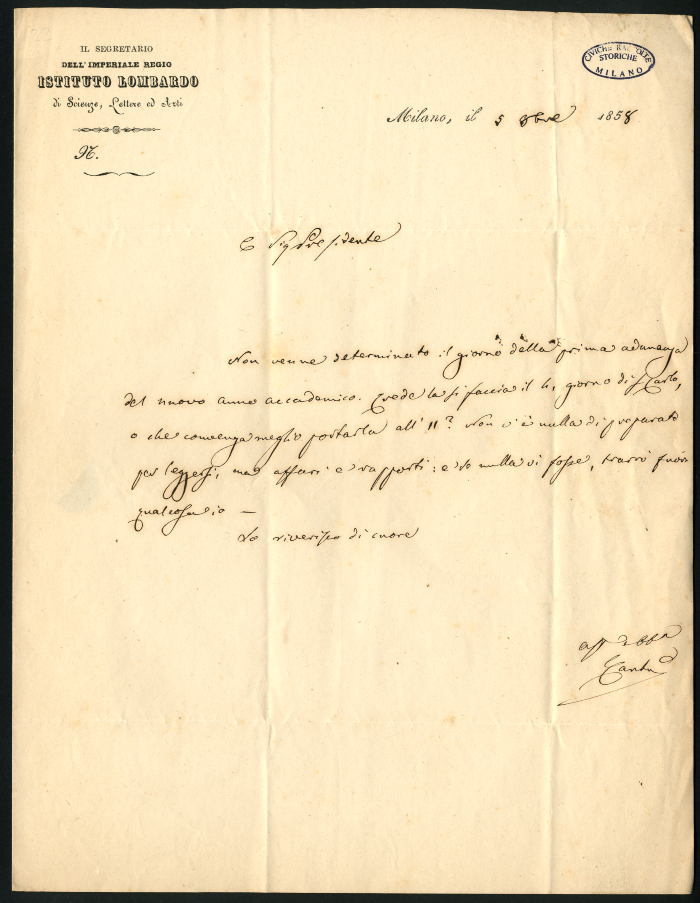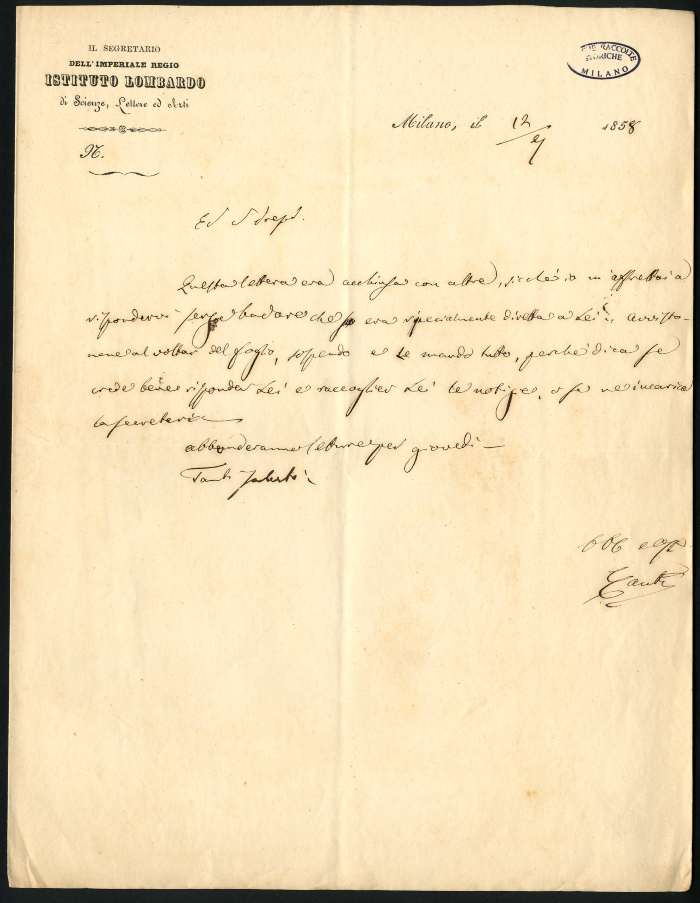 26) Milano, 5 ottobre 1858: Comunica a Verga che non è ancora stato fissato il giorno della prima adunanza del nuovo anno accademico.