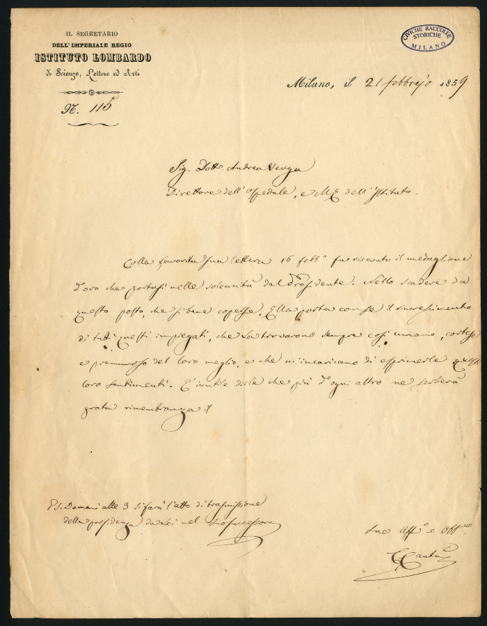 33) Milano, 21 febbraio 1859: Accusa ricevimento del medaglione d'oro che Verga ha portato in qualità di presidente dell'Istituto lombardo e, a nome degli impiegati, esprime il rammarico per lo scadere del suo mandato. Comunica che l'indomani la presidenza sarà trasmessa al suo successore.