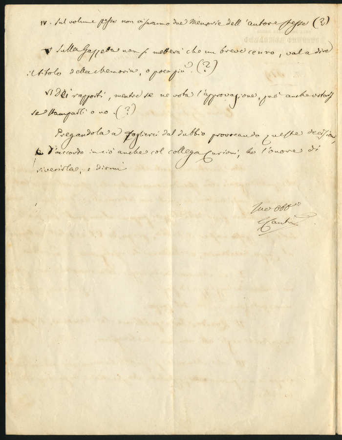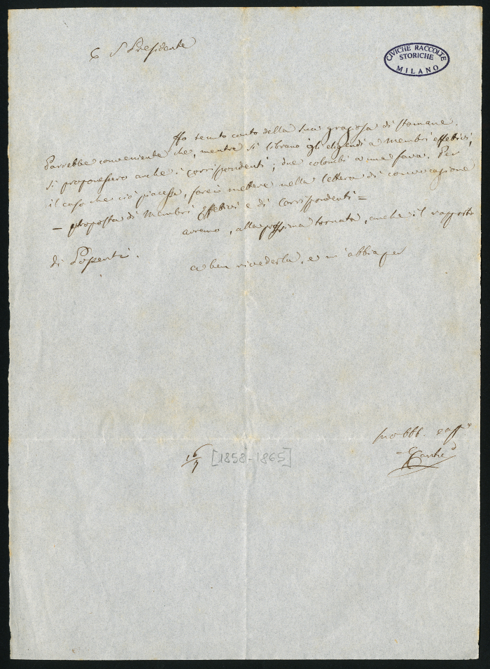 14) Milano, 7 marzo 1858: Informa che gli accademici, usciti dall'adunanza, si sono accorti di aver dimenticato i nomi di Gatti e Ceriani della Biblioteca ambrosiana e Buzzetti della Specola: rimette a Verga la decisione di verbalizzare comunque i nomi o di aspettare la prossima riunione.