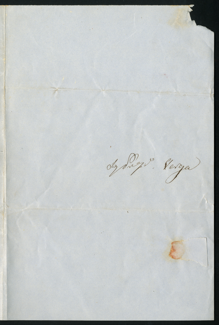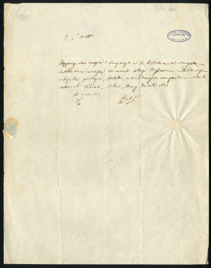 36) [s. l.], 26 ottobre [1852-1865]: Fornisce a Verga alcuni riferimenti bibliografici, sulla storia dei collegi medici. Nomina il Sangiorgio, la Biblioteca del Margeto (?) e l'opera di Tadino.