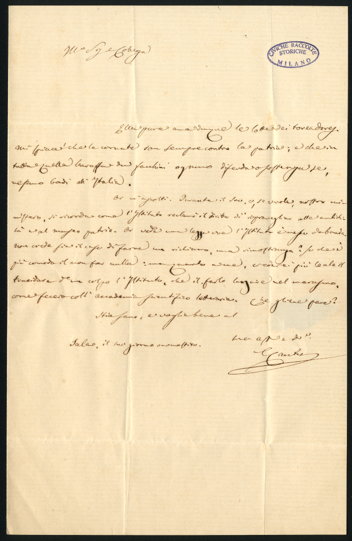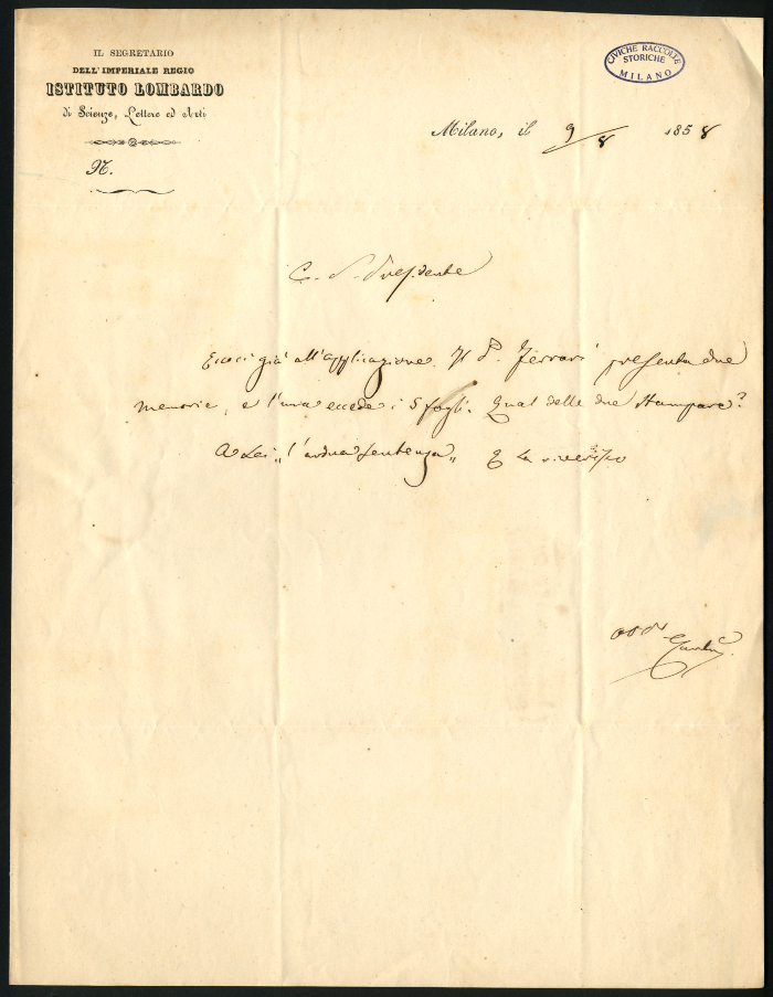 8) Carta intestata "Il segretario / dell'Imperiale regio / Istituto lombardo / di scienze, lettere ed arti". Non è presente l'allegata lettera di Girolami.