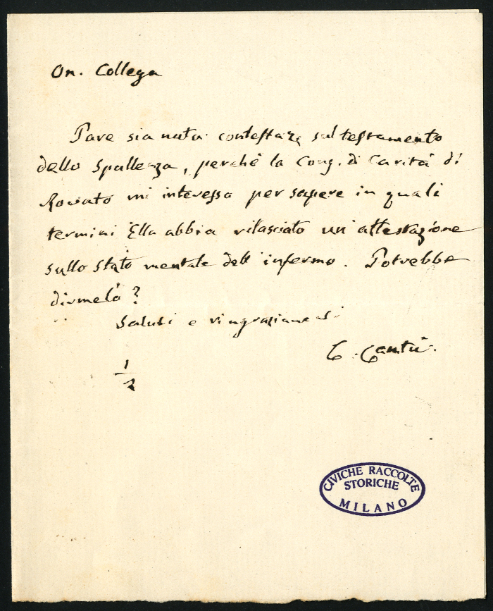 44) [s.l.], 1 febbraio [s.a.]: Informa Verga della contestazione nata in merito al testamento di Spallanza, in seguito alla quale la Congregazione di carità di Rovato avrebbe chiesto a Cantù stesso di interessarsi per sapere in quali termini Verga avrebbe rilasciato un'attestazione sullo stato mentale dell'infermo.