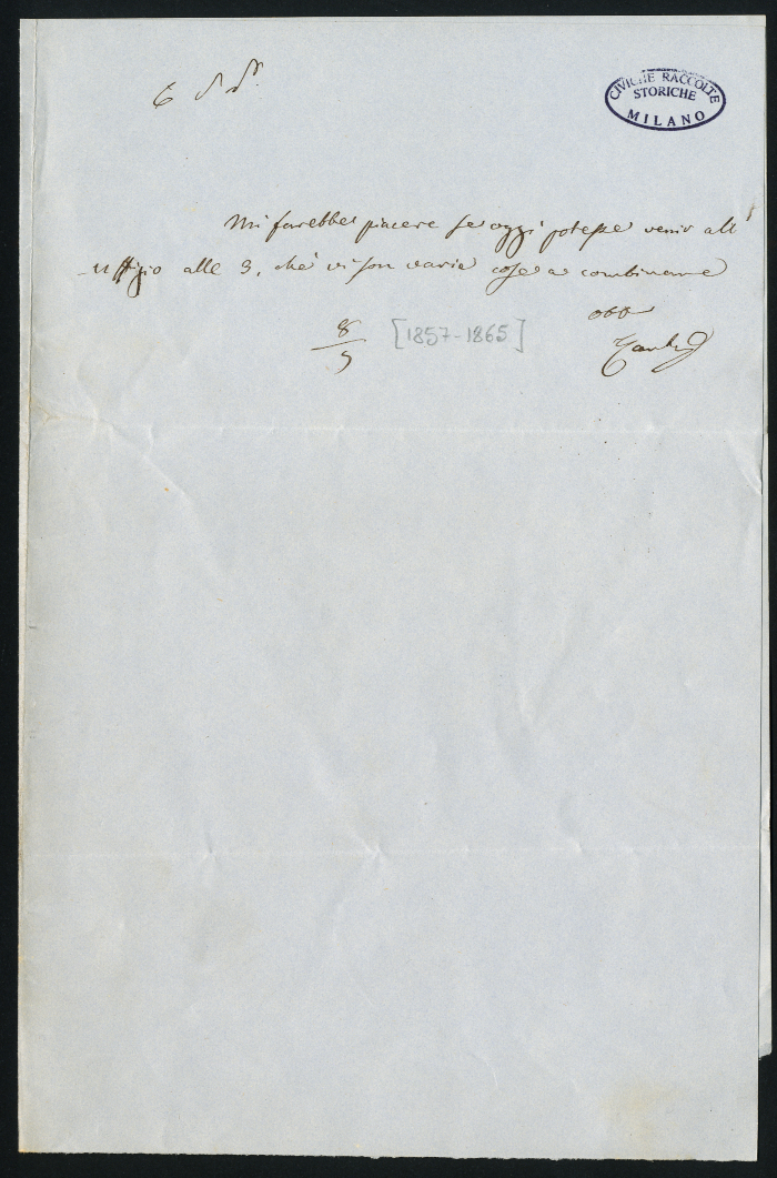 38) [s.l.], 8 maggio [1857-1865]: Chiede a Verga di venire in ufficio il giorno stesso alle 15 per discutere di diversi argomenti.