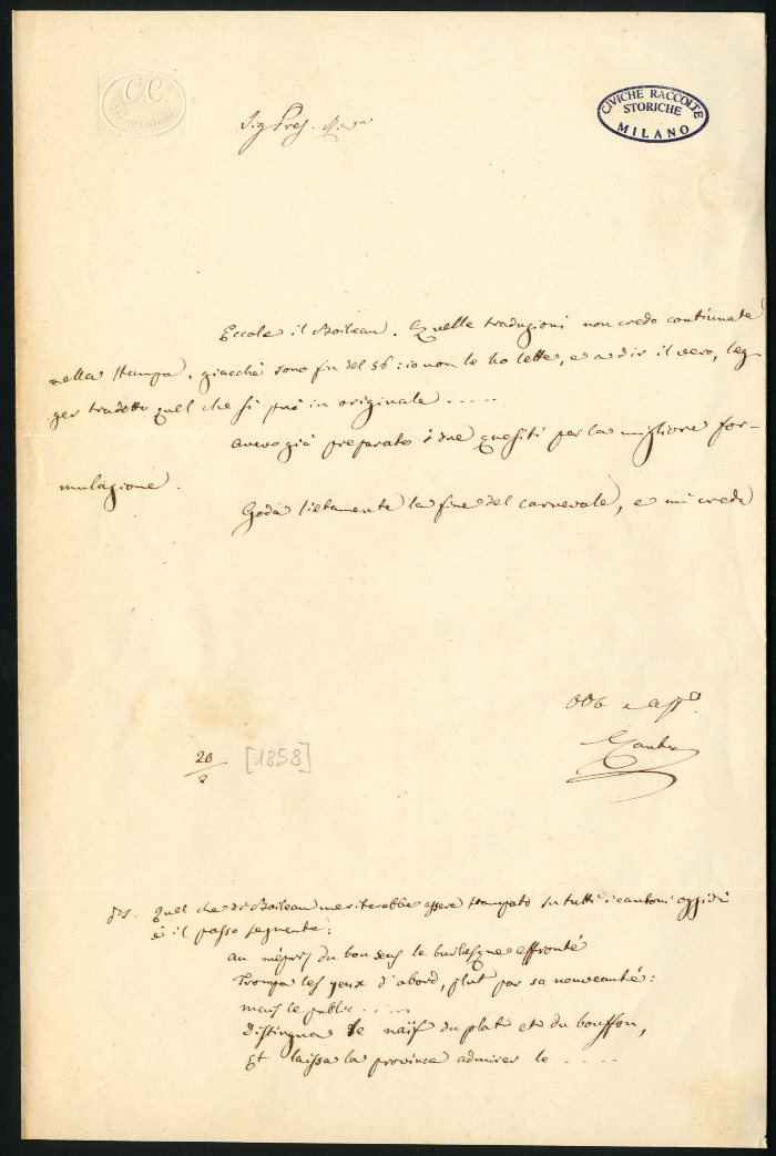 13) [s. l.], 20 febbraio [1858]: Gli manda il Boileau. Le traduzioni risalgono al 1856, ma non le ha lette.