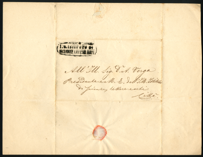 1) Milano, 19 febbraio 1856: Sollecita Verga a continuare a dedicarsi alla nuova opera per l'Istituto [lombardo]. Lo ringrazia per il discorso, di cui apprezza il connubio tra psicologia e filologia, morale e igiene, e il rendiconto. Ha appreso dall'amico Rizzi che Verga gode di migliore salute e dice che non lo va a trovare per rispetto delle sue occupazioni.