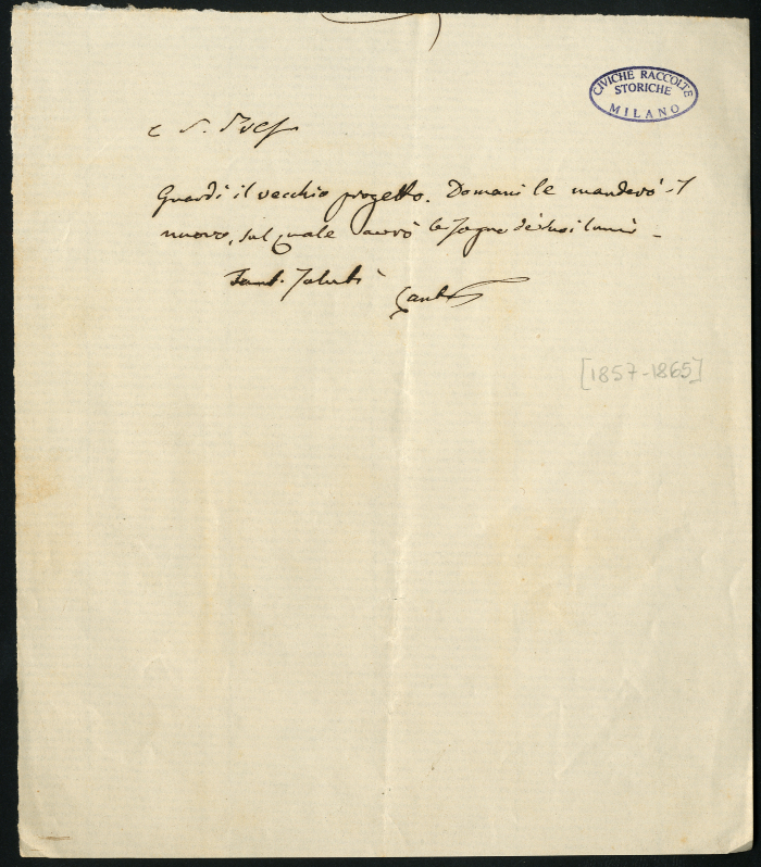 41) [s.l.], [1857-1865]: Chiede a Verga di guardare il vecchio progetto e gli annuncia che l'indomani gli farà avere quello nuovo per cui chiede un parere.