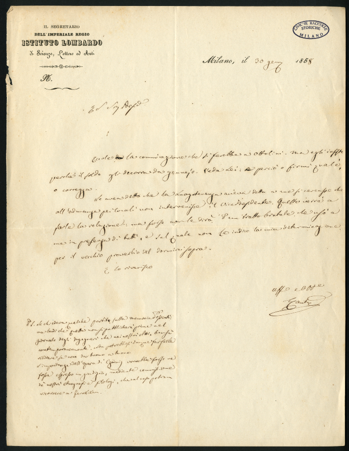 30) Carta intestata "Il segretario / dell'Imperiale regio / Istituto lombardo / di scienze, lettere ed arti".