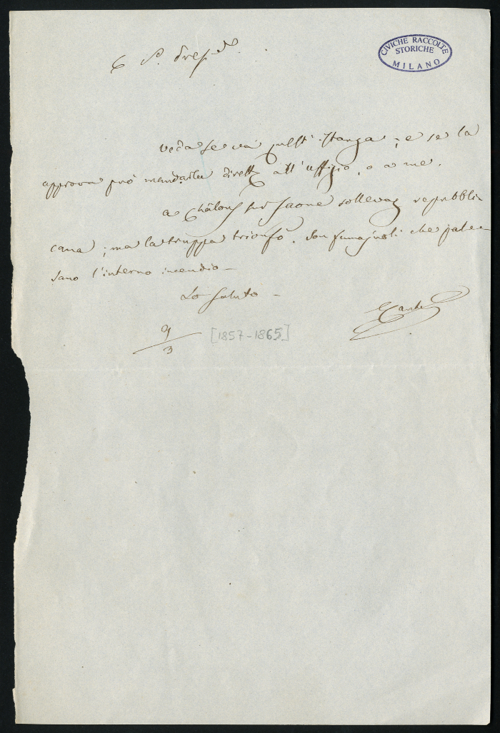 37) [s. l.], 9 marzo [1857-1865]: Chiede a Verga di vedere "se va quell'istanza" e in caso di sua approvazione, di inviarla direttamente all'Ufficio. Lo informa che a Chalons sur Saone vi è stata una sollevazione repubblicana, ma la truppa ha trionfato: "son fumajuoli che palesano l'interno incendio".