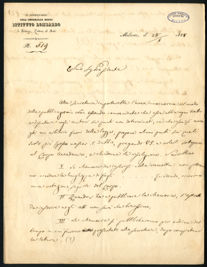 21) Milano, 28 giugno 1858: Sottopone a Verga e alle determinazioni del corpo accademico alcune questioni controverse, promosse dalla segreteria per regolamentare le modalità di pubblicazione e dirimere le dispute con gli autori.