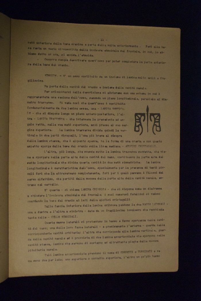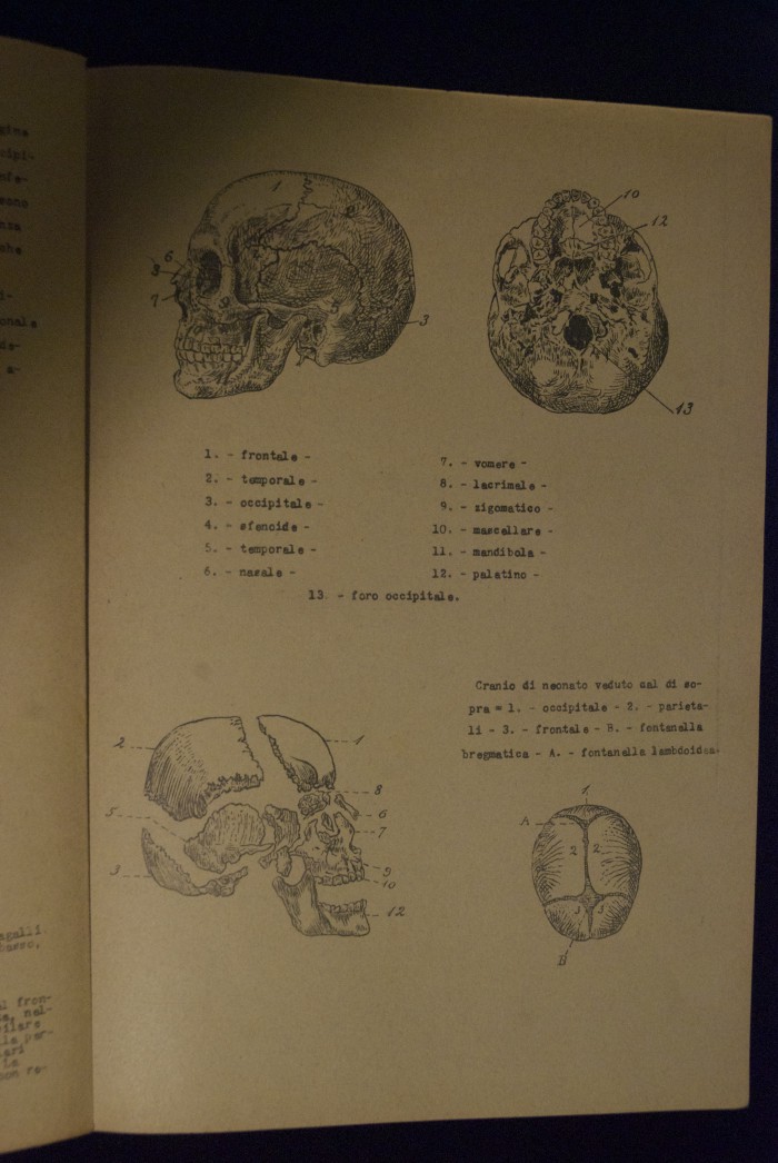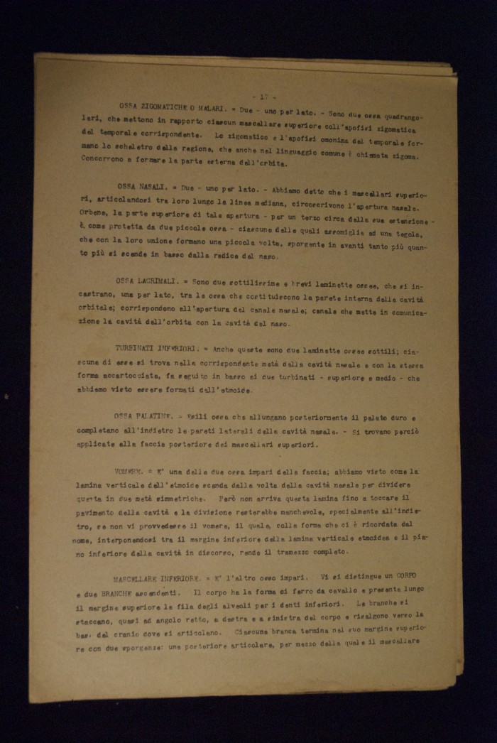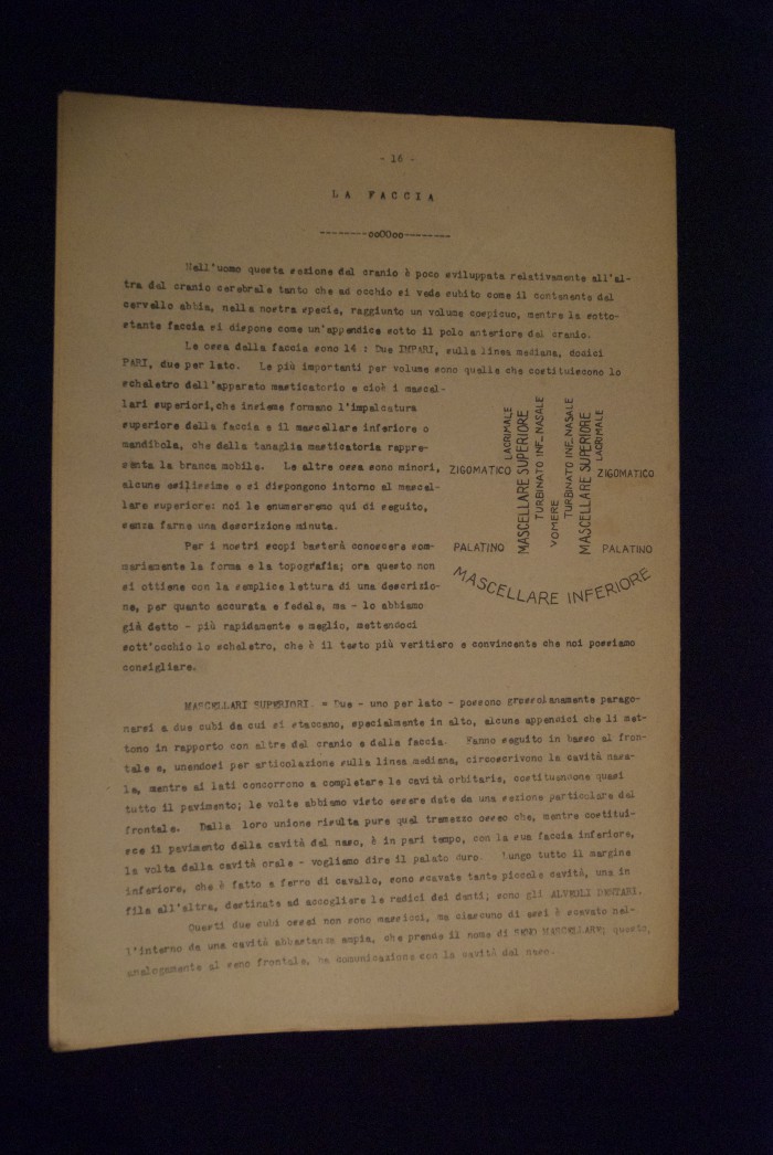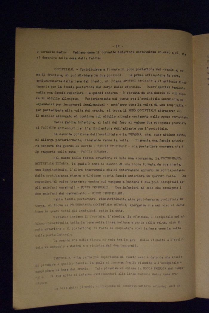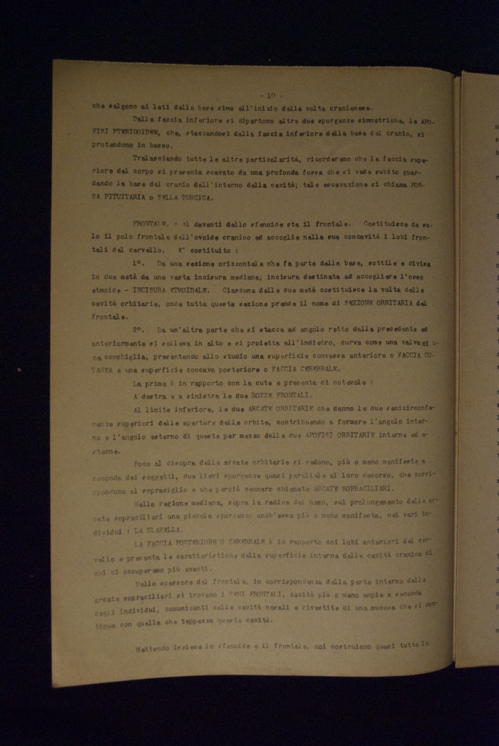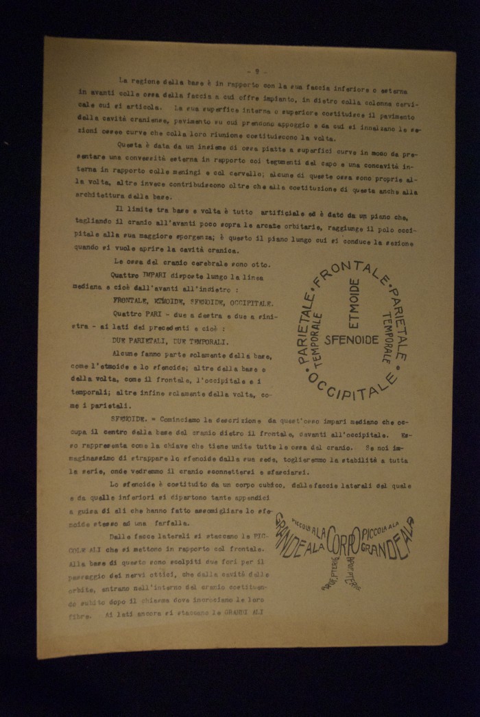 Testo a stampa mutilo di una lezione sull'anatomia del cranio umano. Lo scritto inizia da pagina 9 e si interrompe a pagina 38. L'autore potrebbe essere Pizzoli.