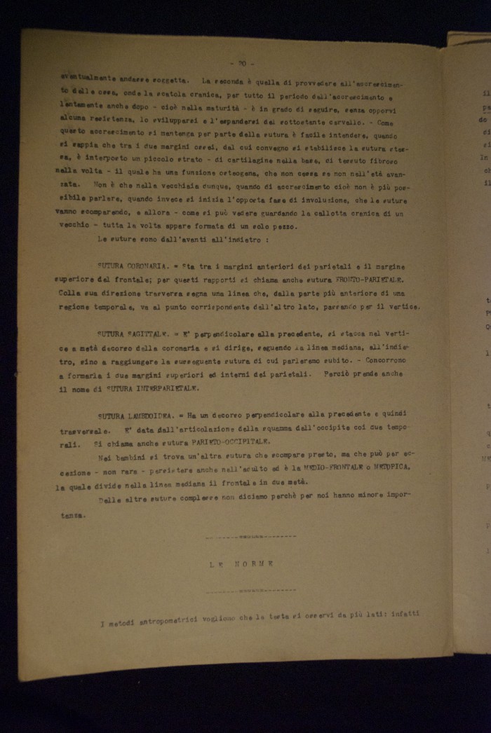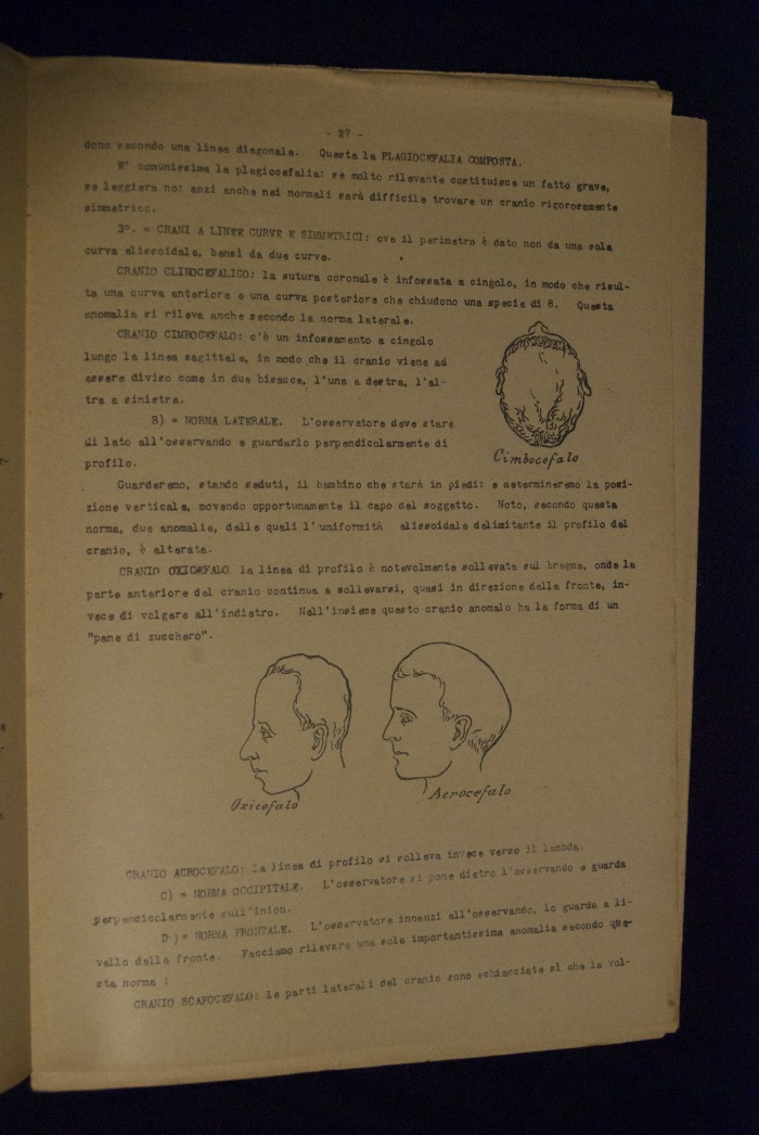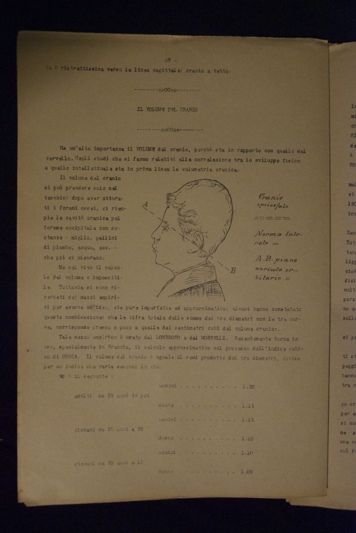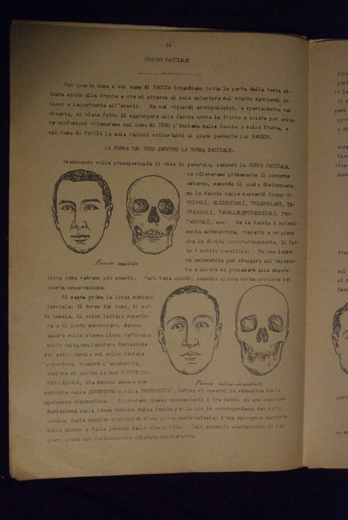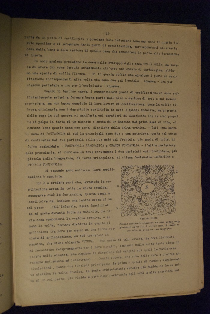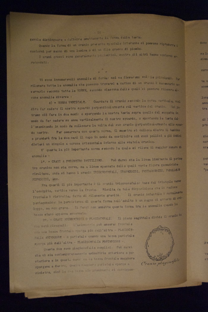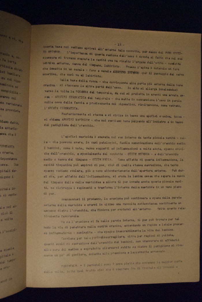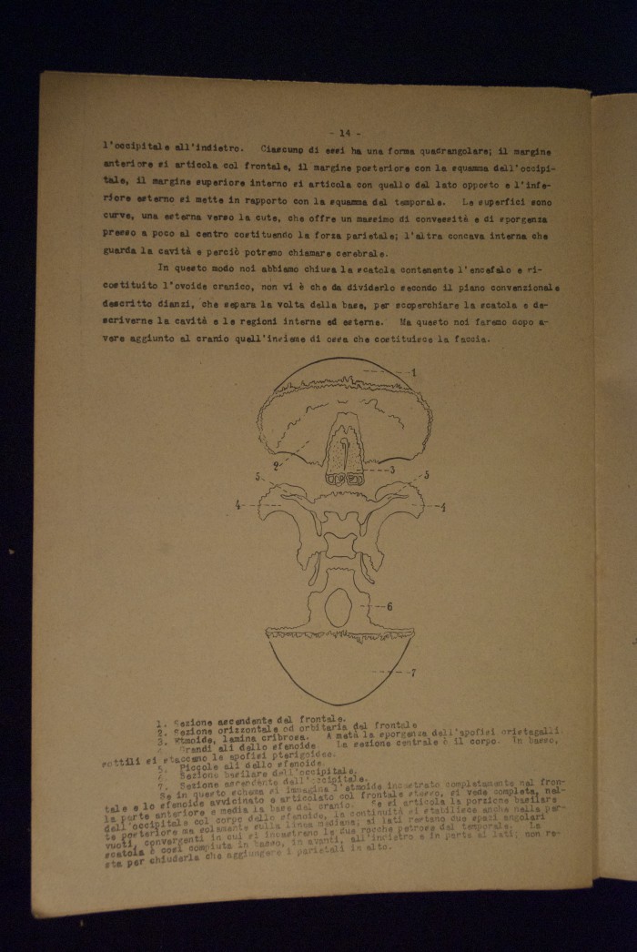 Testo a stampa mutilo di una lezione sull'anatomia del cranio umano. Lo scritto inizia da pagina 9 e si interrompe a pagina 38. L'autore potrebbe essere Pizzoli.