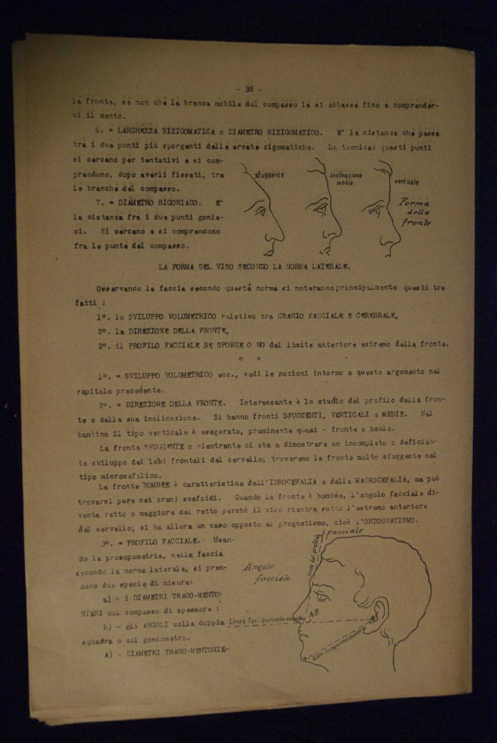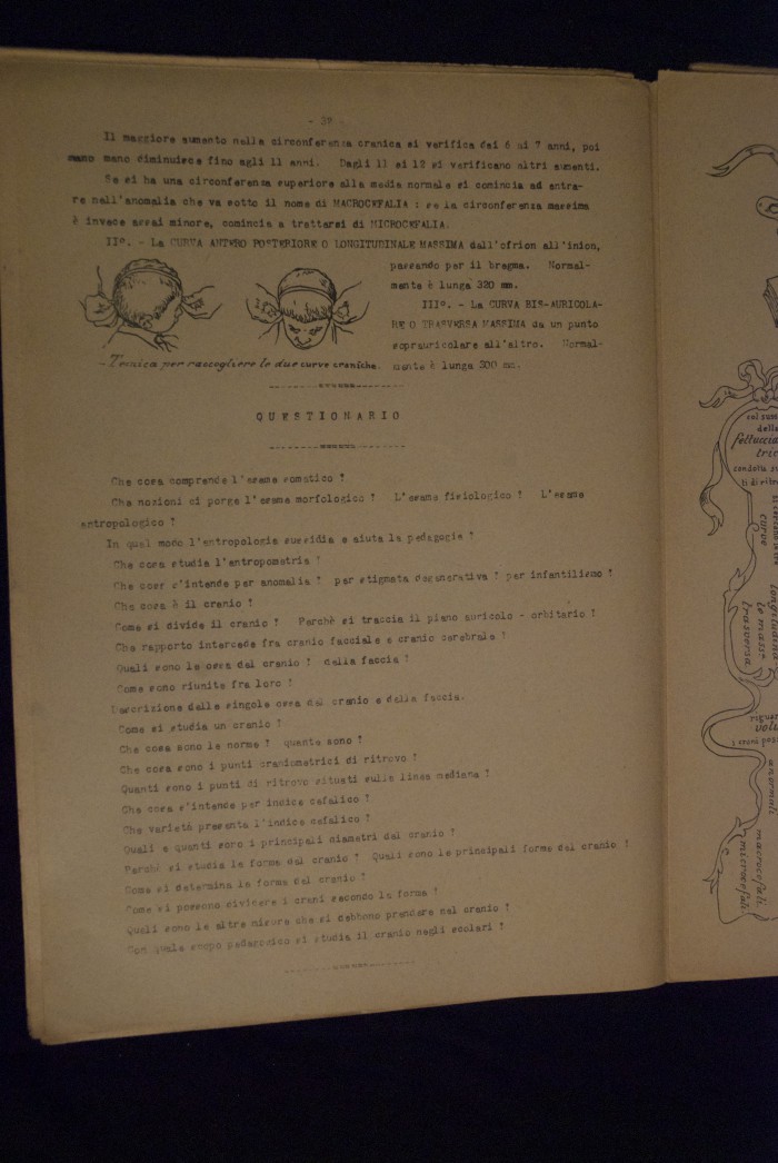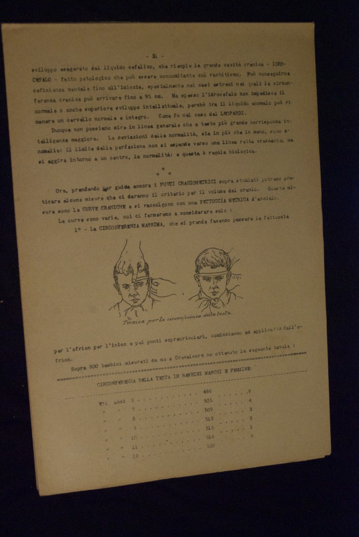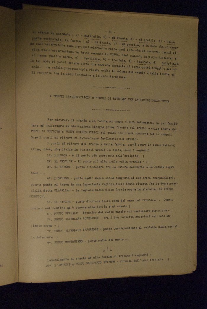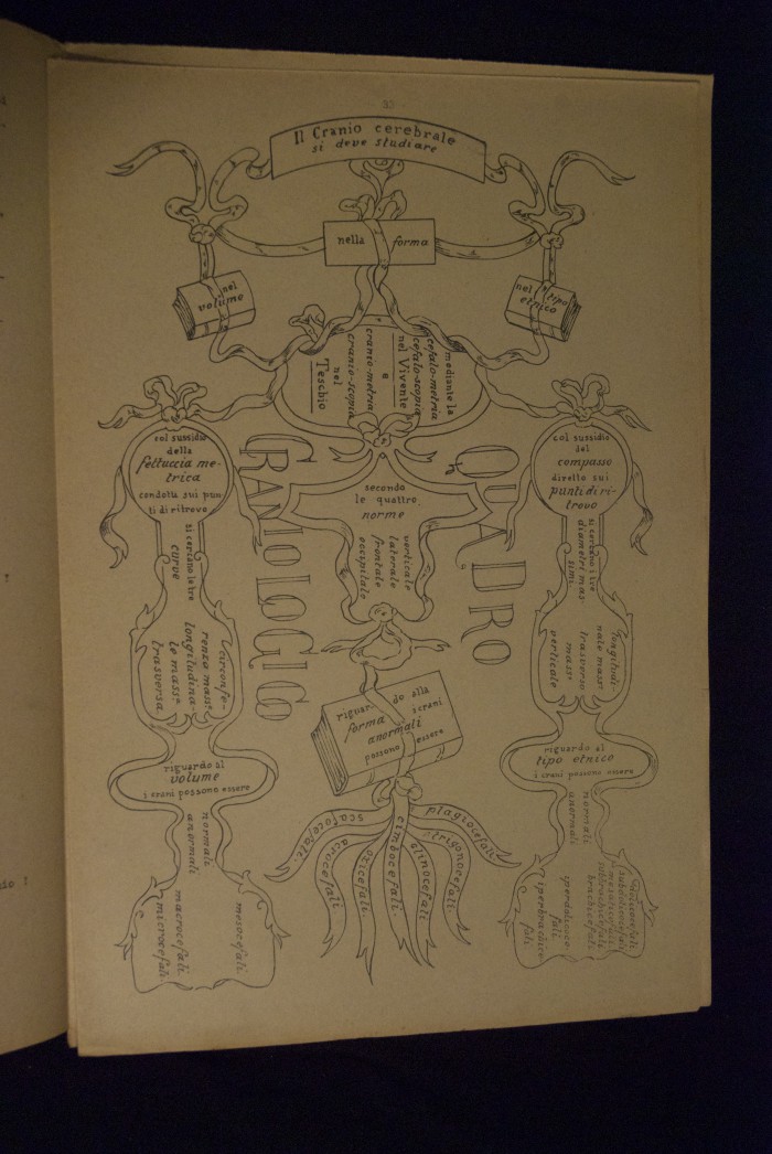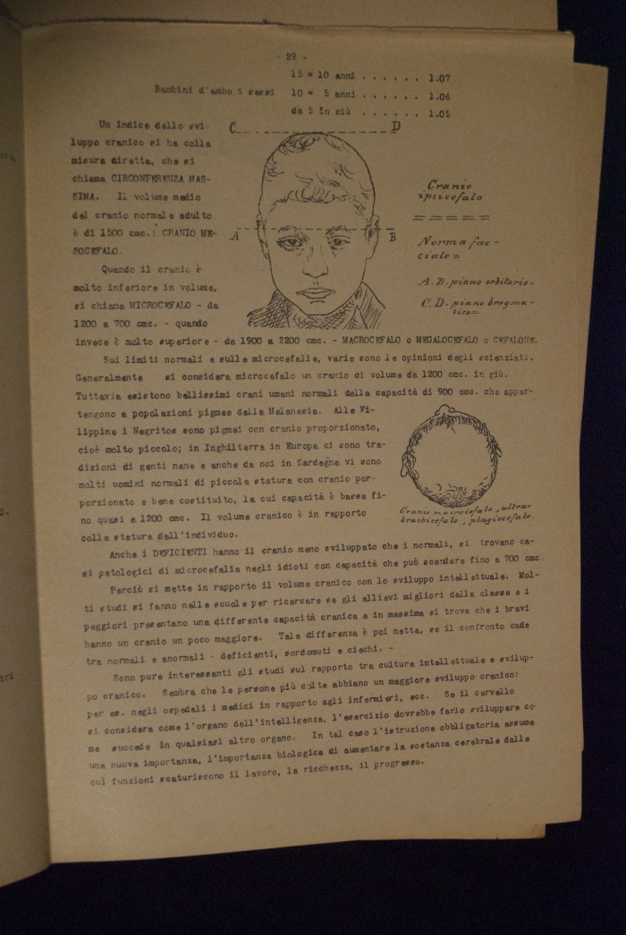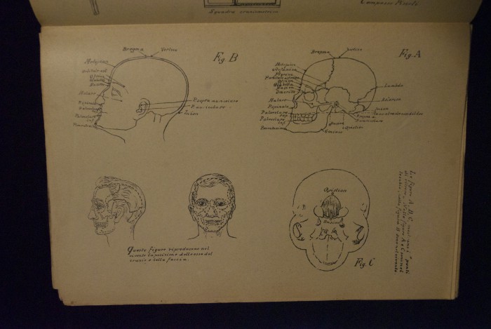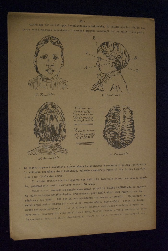 Testo a stampa mutilo di una lezione sull'anatomia del cranio umano. Lo scritto inizia da pagina 9 e si interrompe a pagina 38. L'autore potrebbe essere Pizzoli.