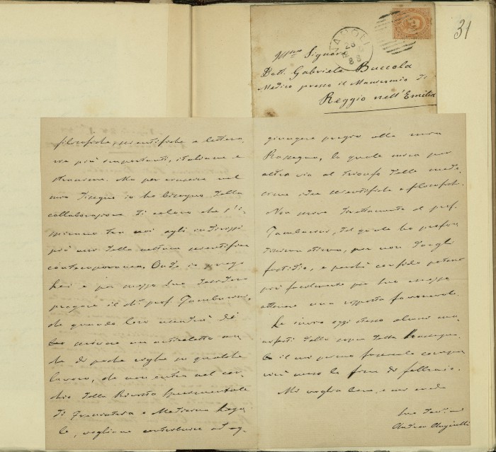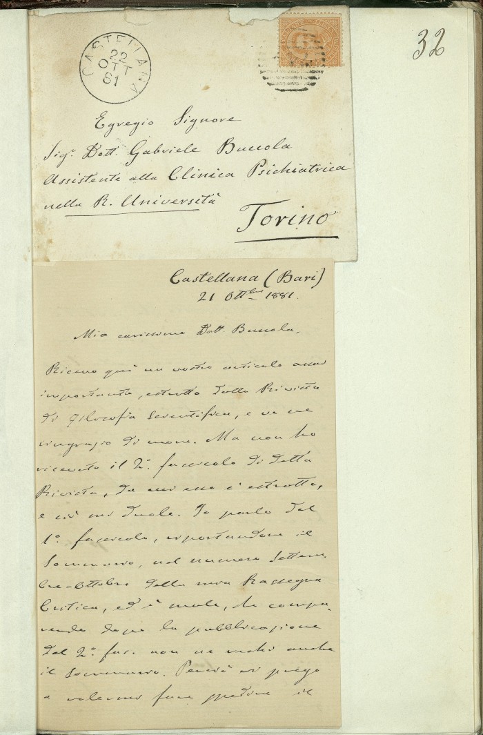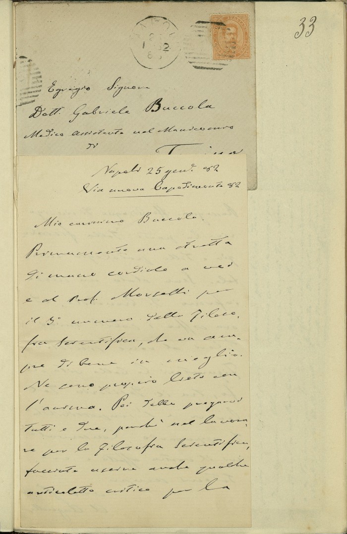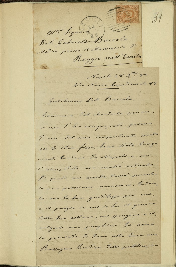2) [Napoli], 28 dicembre 1880: Lo informa di essere in procinto di avviare una “Rassegna Critica delle Pubblicazioni Filosofiche, Scientifiche e Letterarie più importanti italiane e straniere” e che, per riuscire in tale intento, ha bisogno della collaborazione di coloro che “s’ispirano tra noi agli indirizzi più nuovi della cultura scientifica contemporanea”: lo prega pertanto di chiedere al Prof. Tamburini di scrivere per lui un articolo che non rientri nel novero della Rivista Sperimentale di Freniatria e Medicina legale. Gli confida di aver chiesto la sua intercessione per poter ottenere più facilmente una risposta formale da parte del Prof. Tamburini.