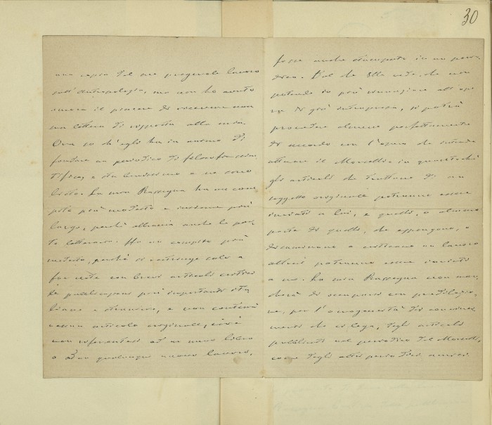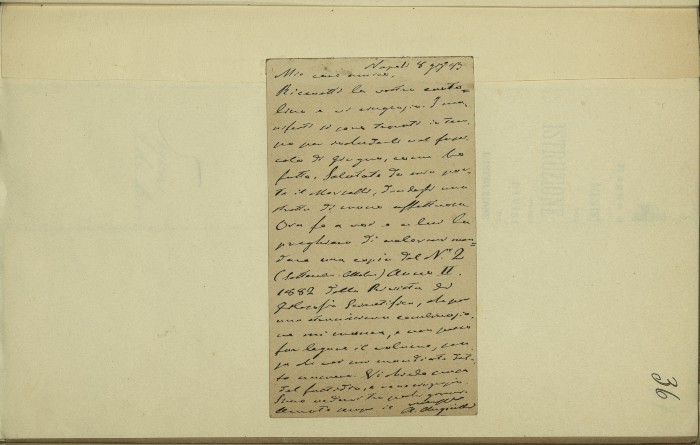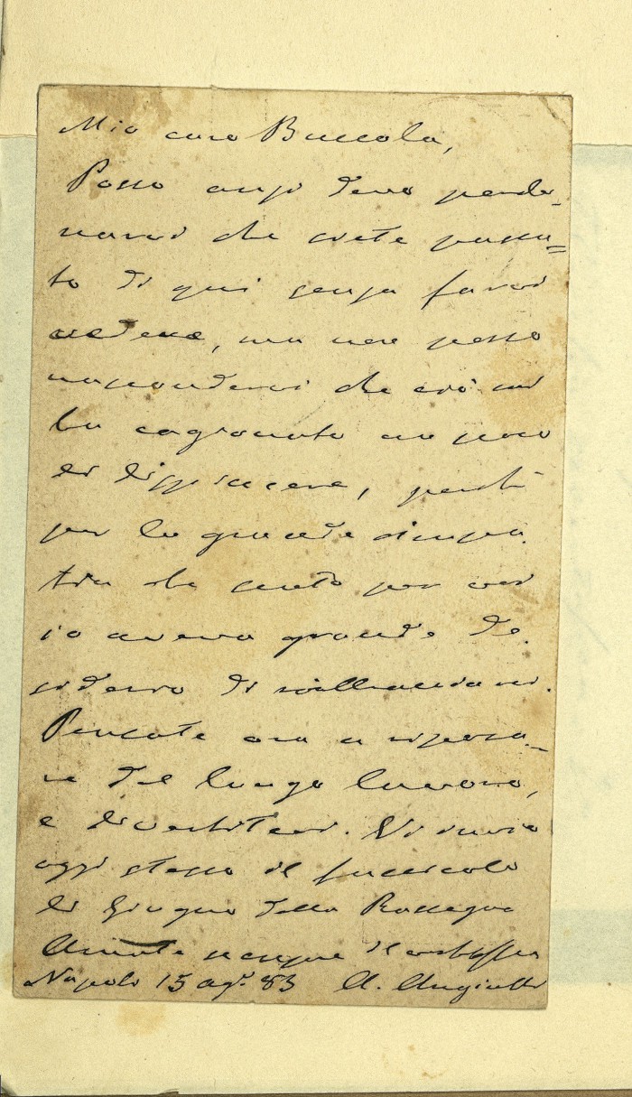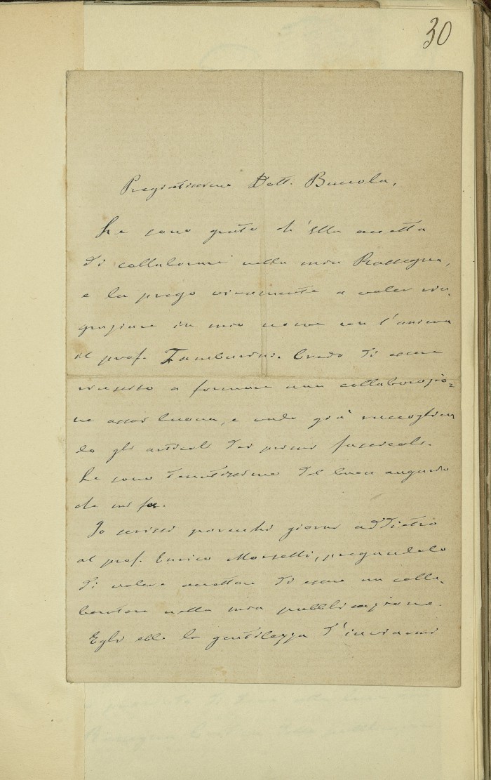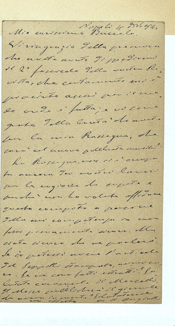 3) [Napoli], 30 aprile 1881: Lo ringrazia per l’invio del suo ultimo lavoro e lo esorta a scrivere un articolo per la “Rassegna”. Conclude inviando i propri saluti anche al Prof. Morselli e al Prof. Tamburini.