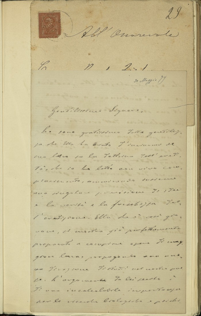 1) [Napoli], 30 maggio 1879: Lo ringrazia per l’invio del libro “La dottrina dell’Eredità” che ha letto con grande interesse soprattutto per la “singolare precisione di idee, la novità e la freschezza dell’erudizione”. Lo elogia per l’accuratezza dei suoi studi e gli rammenta che l’argomento scelto è molto importante nonché trasversale alle varie discipline; lo sprona, pertanto, a proseguire nello “studio intorno alla cognizione esplicativa dell’eredità”, problema non risolto neanche a seguito della teoria di Darwin.