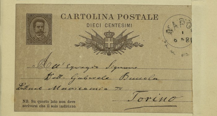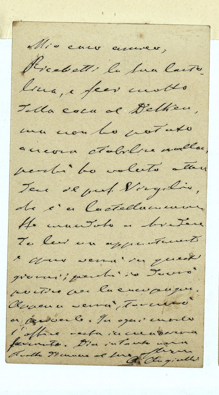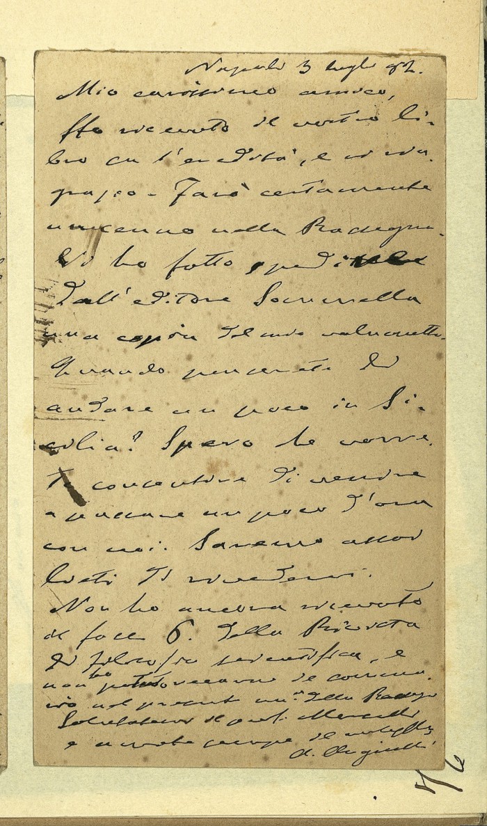 4) [Napoli], 1 settembre 1881: Gli comunica di aver ricevuto la sua cartolina e di aver già avvisato il Delken, sottolineando di non aver potuto ancora definire nulla, perché in attesa del prof. Virgilio che si trova a Castellammare; a tal proposito, lo informa di avergli fissato, un appuntamento.