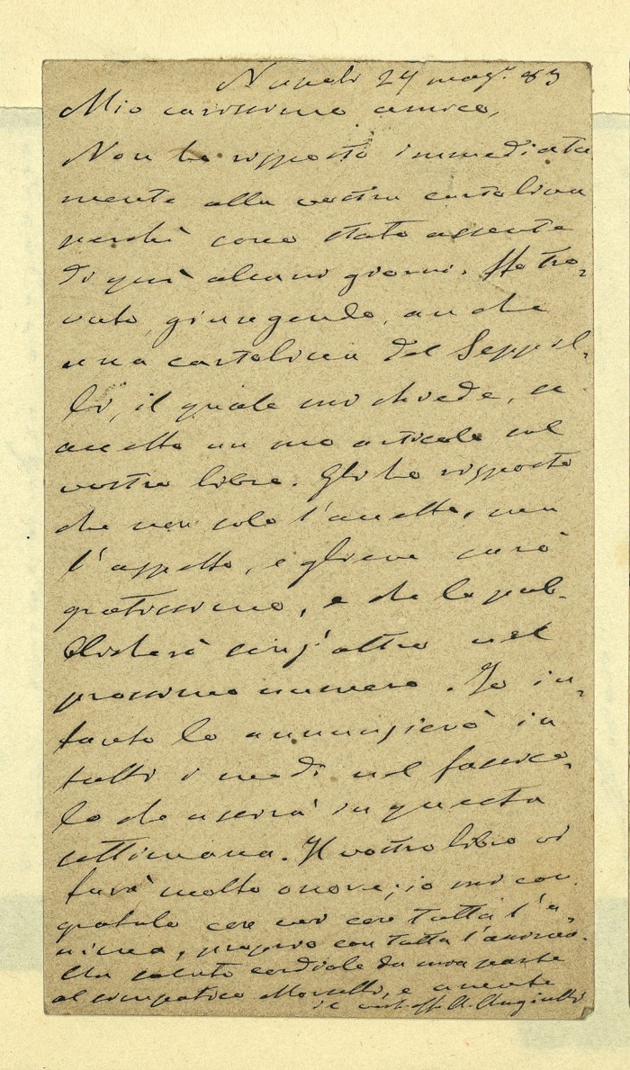 12) [Napoli], 15 agosto 1883: Si rammarica per non aver potuto incontrare l'amico a Napoli e gli comunica che provvederà a inviargli quel giorno stesso il fascicolo di giugno della Rassegna.