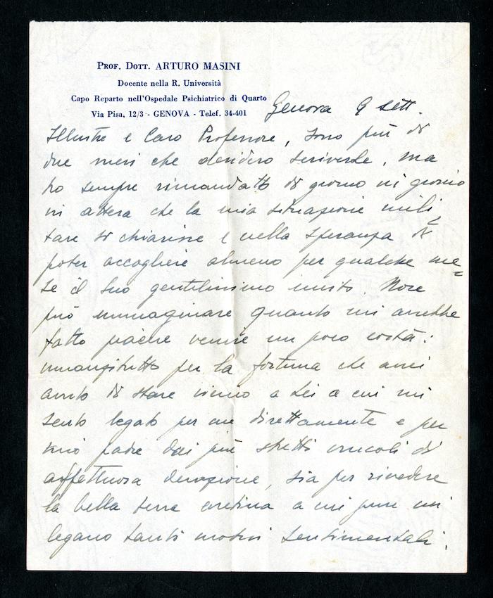 Carta intestata: Prof. Dott. Arturo Masini | Docente nella R. Università | Capo Reparto nell'Ospedale Psichiatrico di Quarto | Via Pisa, 12/3 - Genova