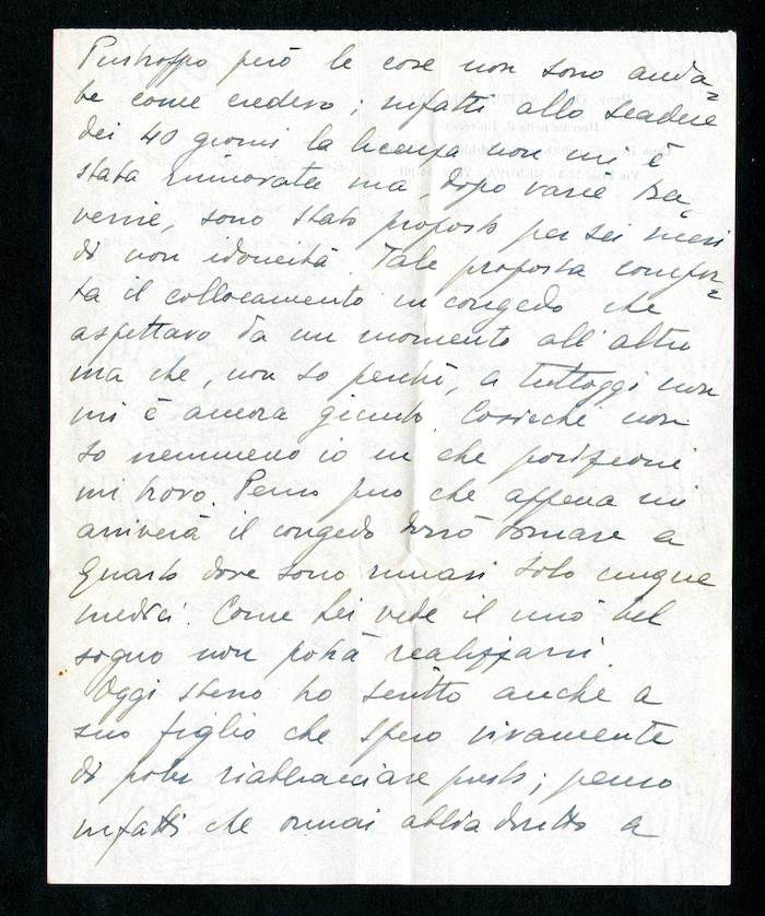 3) Genova, 9 settembre s.a.: si scusa per il ritardo con cui gli scrive, dovuto all'attesa di conoscere la sua posizione militare, motivo che gli ha anche impedito di approfittare del gradito invito di Pieraccini ad Arezzo. Racconta che la licenza non gli è stata rinnovata, ma che dovrebbe arrivare il congedo. In tal caso dovrà probabilmente rientrare subito a Quarto, dove sono rimasti solo cinque medici. Riferisce di aver scritto al figlio di Pieraccini [Carlo], che si augura di poter presto riabbracciare, ricordando i piacevoli momenti trascorsi insieme in Montenegro. Si rammarica di non avergli potuto telefonare da Roma, anche se ritiene che abbia avuto notizie sue e di Carlo da sua sorella. Auspica di avere l'occasione di incontrare anche Pieraccini.