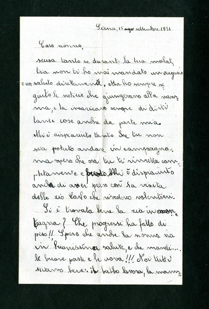 1) Siena, 15 settembre 1931: si scusa per il riatrdo con cui scrive e si augura che si sia rimesso in salute. Chiede notizie della zia e della nonna. Fornisce ragguagli sui suoi genitori e sulle sue giornate.