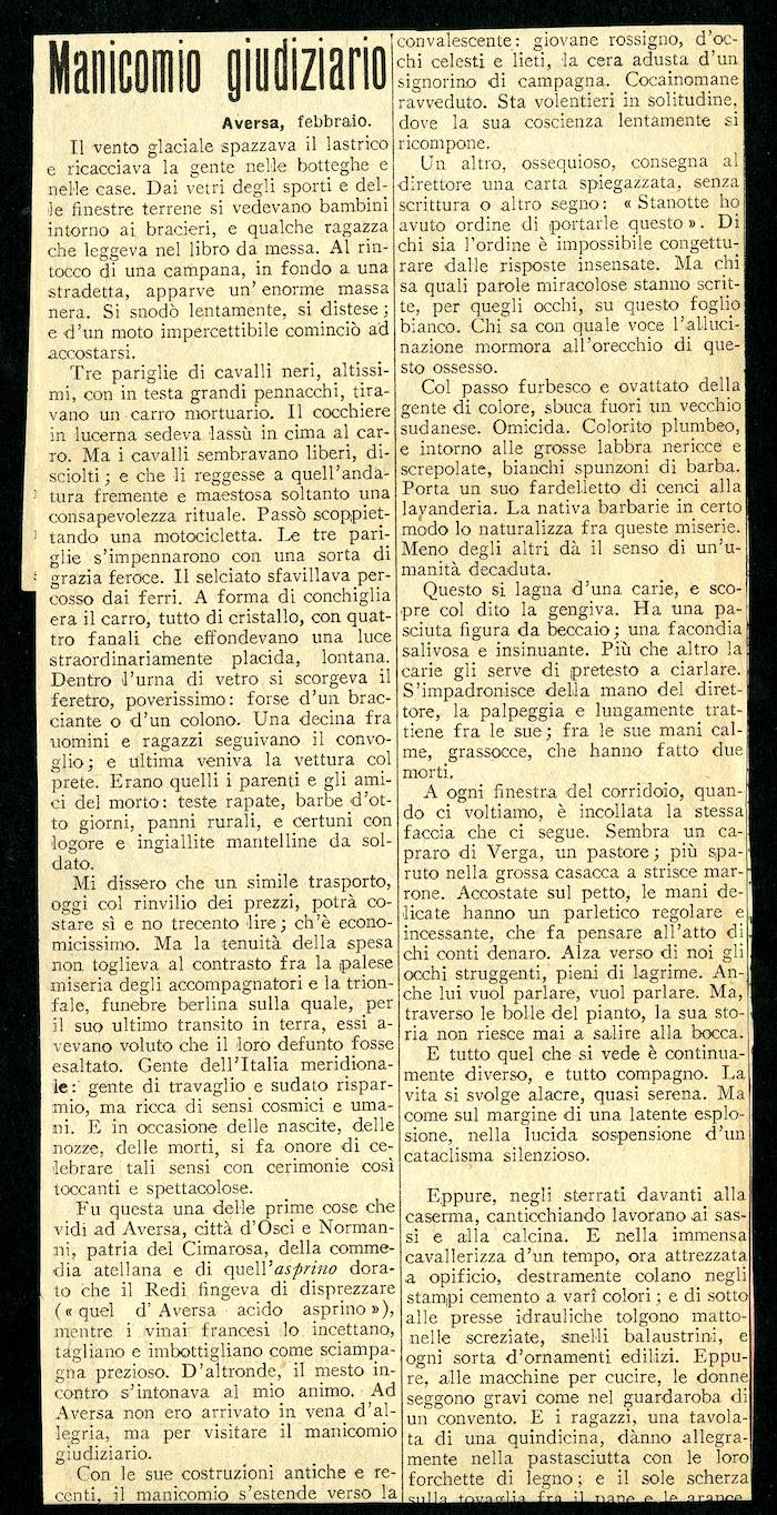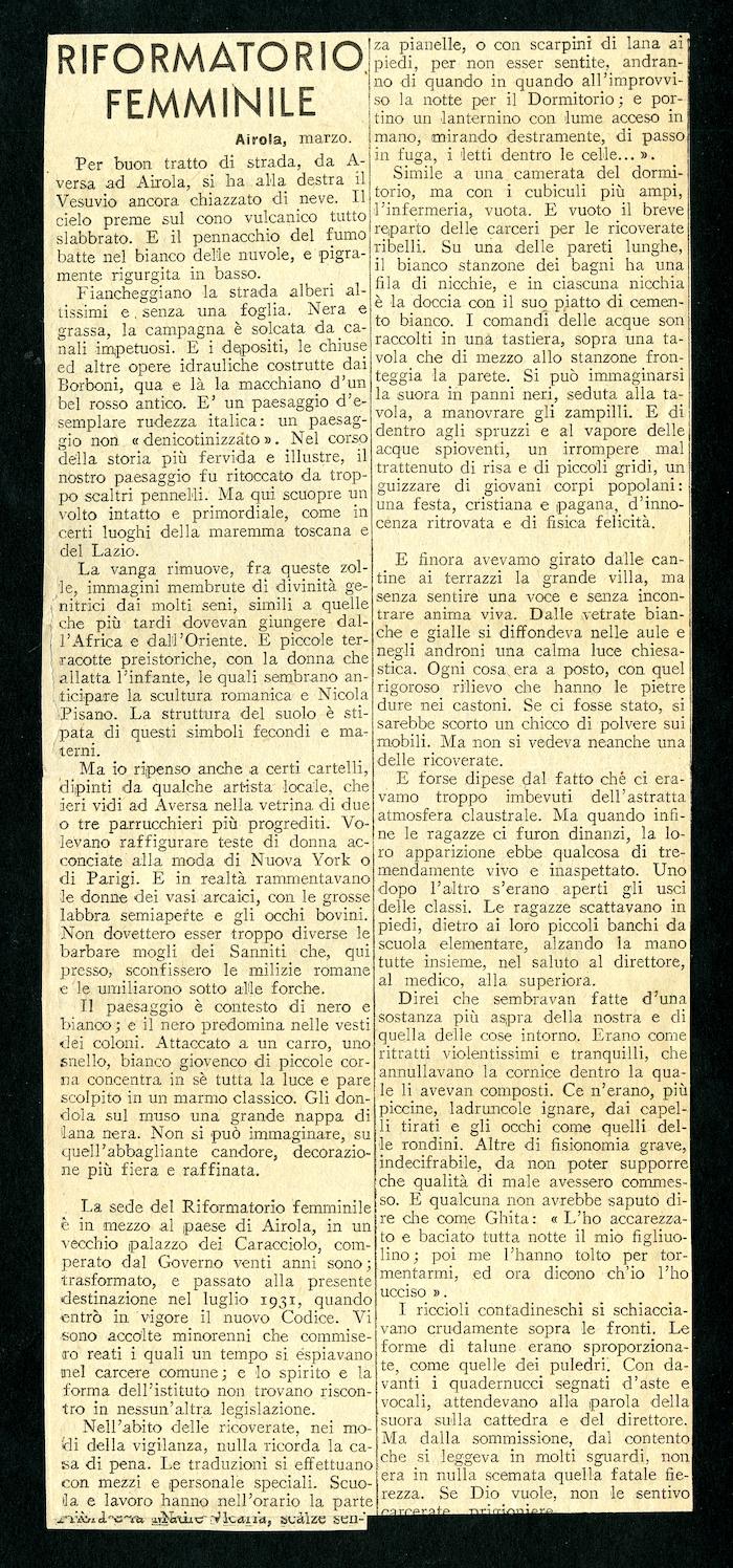 2) Roma, 20 aprile 1934: informa Pieraccini che sarà a Firenze il 25 aprile e che vorrebbe passare a trovarlo il 26 o il 27 per salutarlo e per parlargli di un articolo che ha intenzione di scrivere per il "Corriere della sera" sul manicomio di Arezzo. Acclude due ritagli con i pezzi che ha dedicato al manicomio giudiziario di Aversa e al riformatorio femminile di Airola, aggiungendo che il direttore di Aversa, Filippo Saporito, lo ricorda con piacere. Riferisce che Gina è passata domenica.