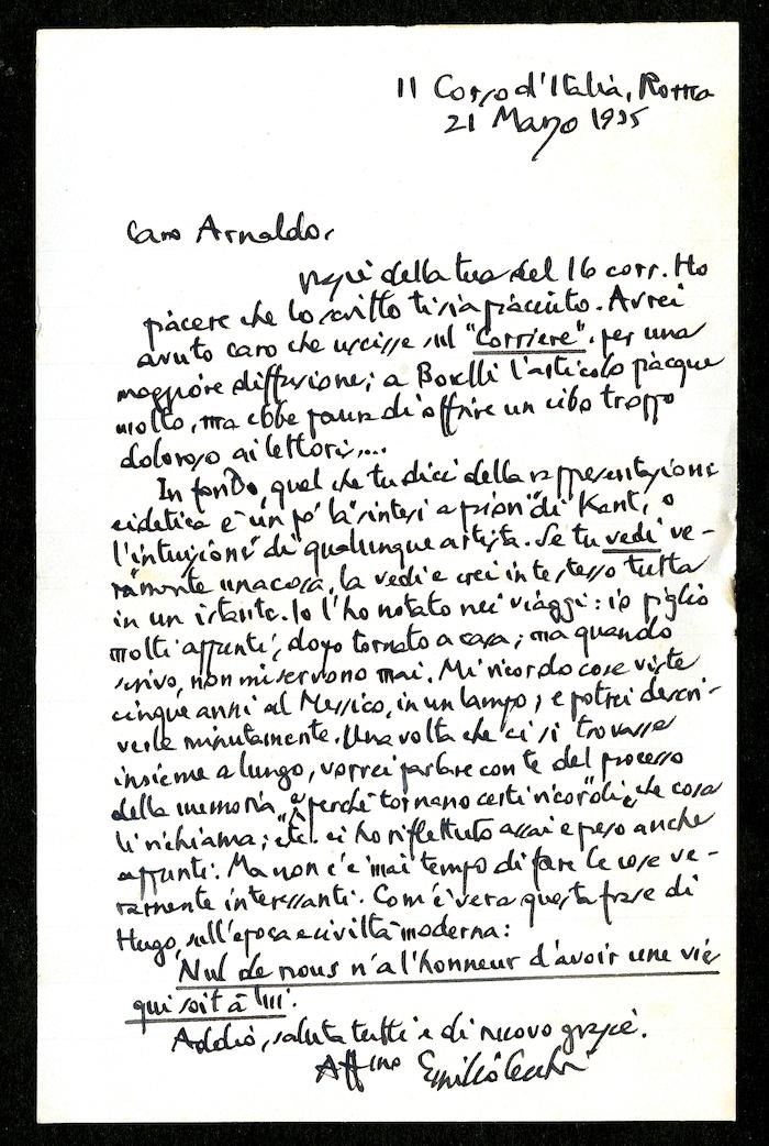 3) Roma, 21 marzo 1935: si compiace che il cognato abbia apprezzato il suo articolo, rammaricandosi tuttavia che non sia uscito sul "Corriere della sera", malgrado il giudizio positivo del direttore Aldo Borelli. Ritiene che quello che Pieraccini dice della "rappresentazione eidetica" somigli alla "sintesi a priori di Kant" e all'intuizione artistica. Aggiunge che gli piacerebbe discorrere insieme del processo della memoria, tema che lo affascina e sul quale ha preso svariati appunti, spiacente che non ci sia mai il tempo "di fare le cose veramente interessanti". Conclude con una frase di Victor Hugo che gli pare particolarmente pertinente: "Nul de nous n'a l'honneur d'avoir une vie qui soit à lui".
