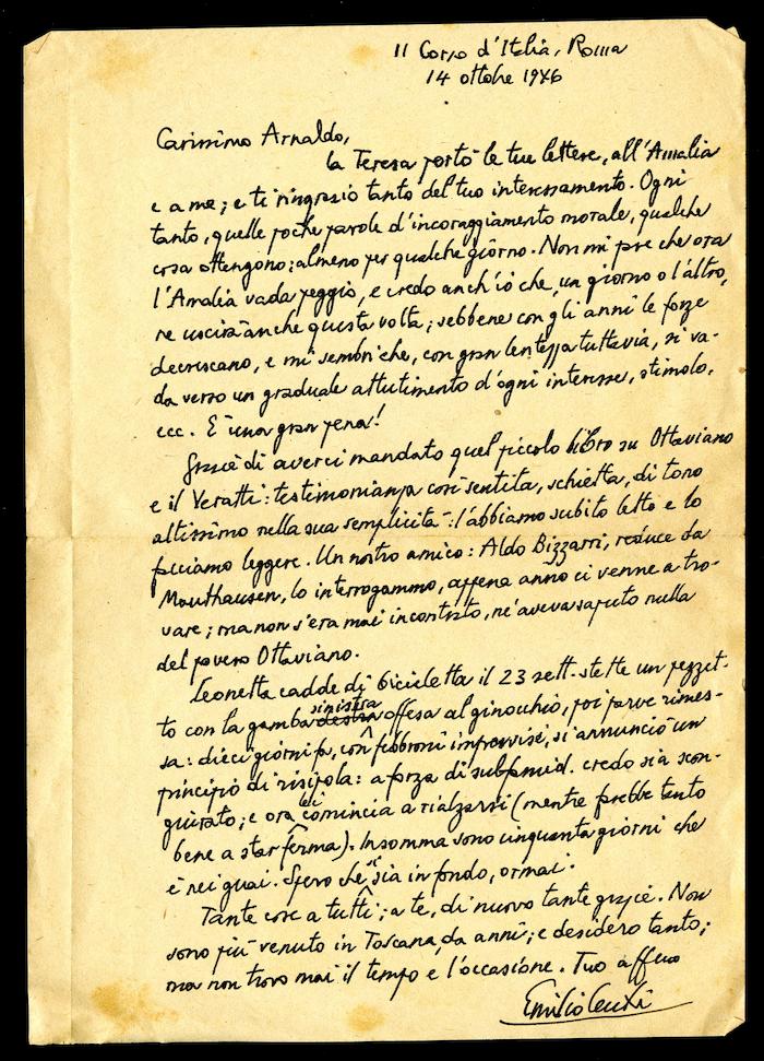 5) Roma, 14 ottobre 1946: ringrazia per le lettere che ha mandato a lui e ad Amalia tramite Teresa e che gli sono di conforto e incoraggiamento. Anche lui trova che sua sorella Amalia non stia peggio e che probabilmente riuscirà a recuperare anche questa volta, nonostante con il trascorrere degli anni le forze sembrino diminuire. Ringrazia per il libro su Ottaviano Pieraccini e Roberto Veratti [Per una stessa fede vissero uniti e caddero, Milano 1946], che hanno subito letto e fanno leggere. Informa Pieraccini di avere parlato con l'amico Aldo Bizzarri, reduce da Mauthausen, il quale però non ha saputo dire nulla del povero Ottaviano, che non ha mai incontrato. Racconta che la moglie Leonetta è caduta dalla bicicletta il 23 settembre con conseguenze alla gamba sinistra da cui sembrava essersi poi ripresa. All'inizio di ottobre sono subentrati episodi improvvisi di febbre alta che hanno fatto temere un principio di risipola, scongiurato grazie alla somministrazione di sulfamidici. Invia saluti a tutti, con l'auspicio di potersi presto recare in Toscana, dove manca ormai da anni.