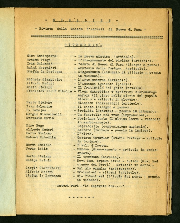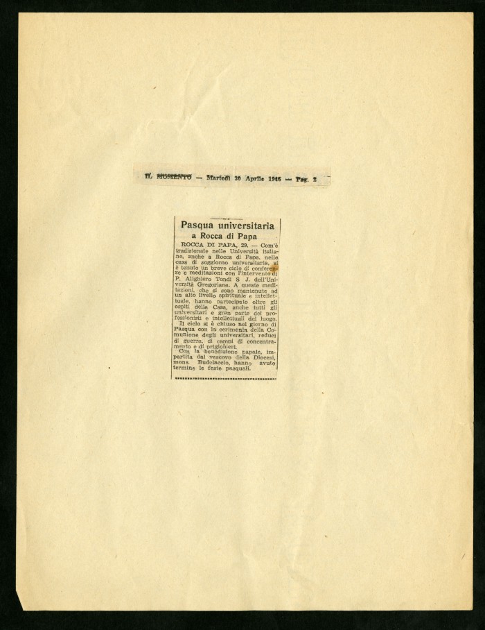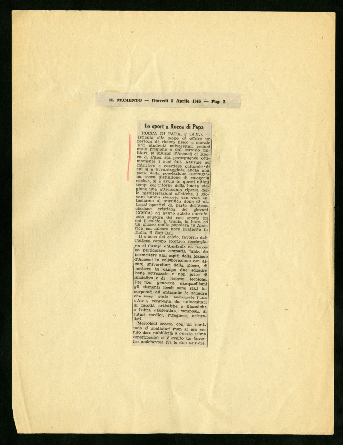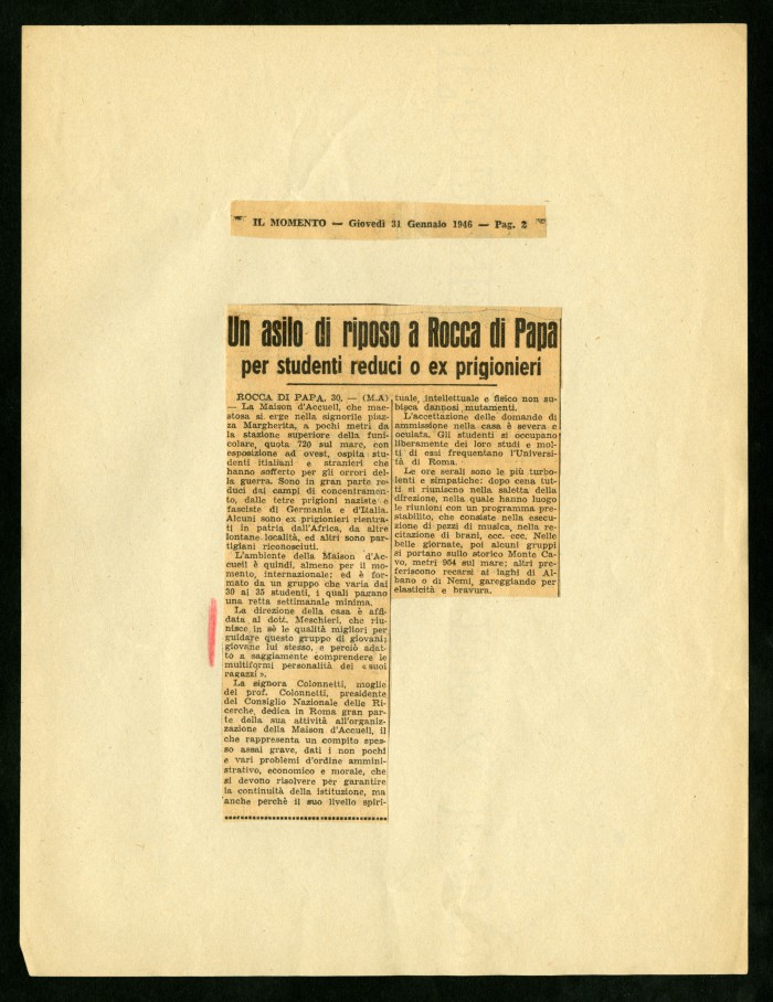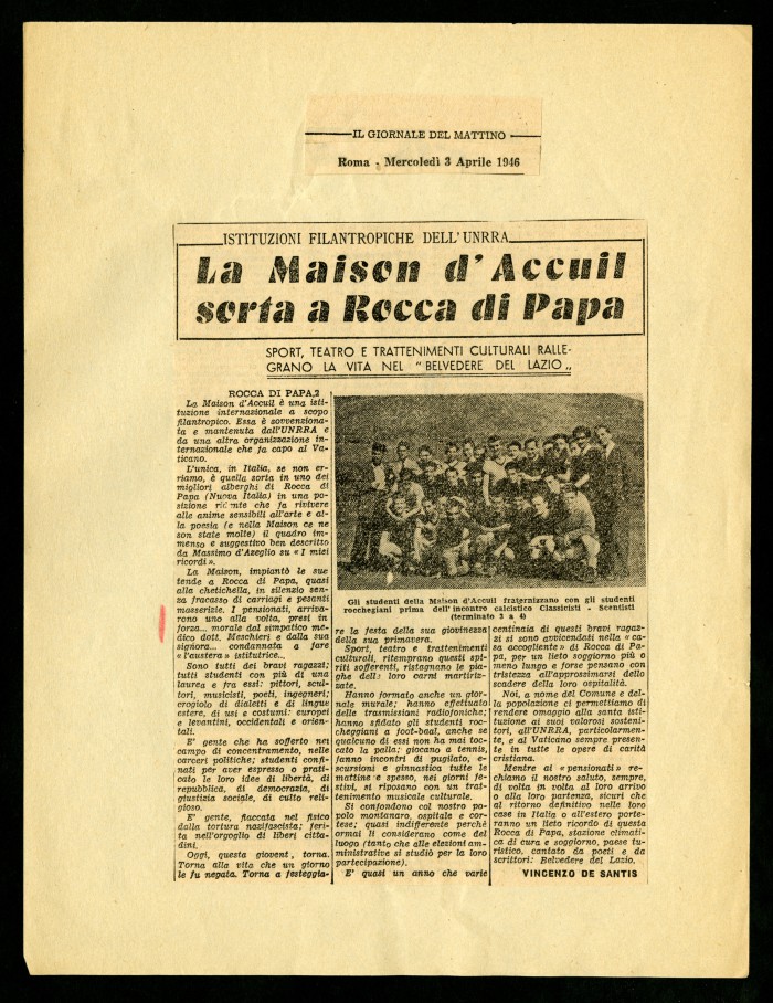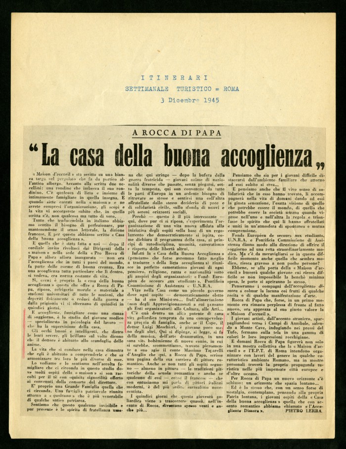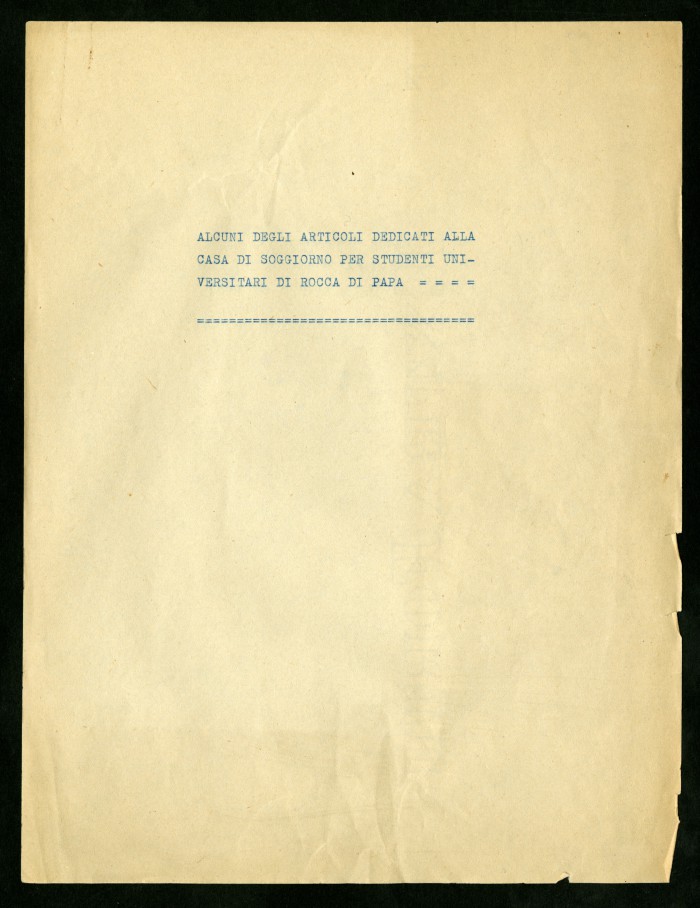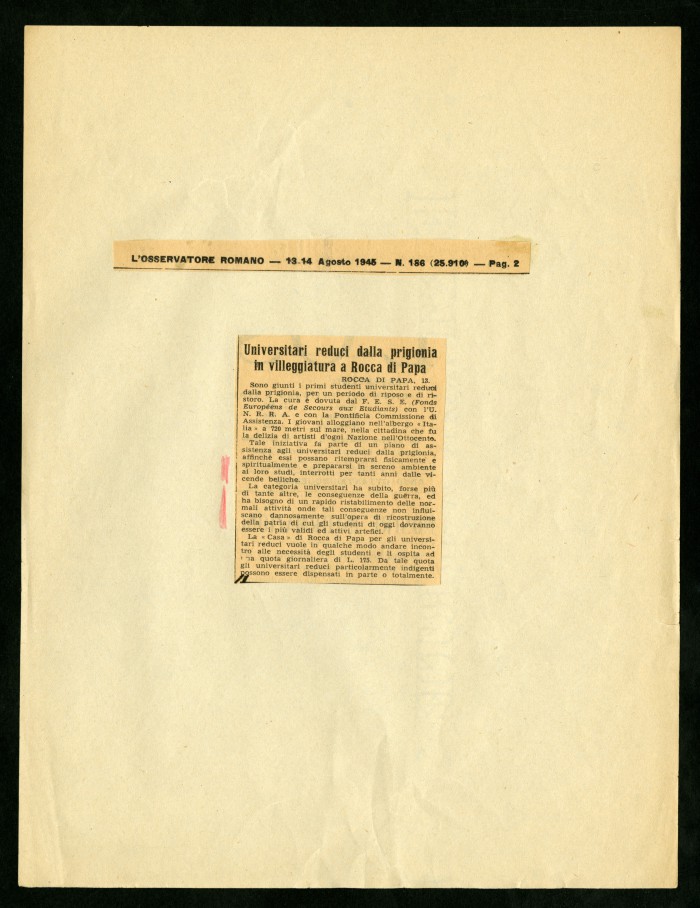 1) "Alcuni degli articoli dedicati alla Casa di soggiorno (...) di Rocca di Papa": articoli a stampa ritagliati da diverse testate giornalistiche, 13 agosto 1945 - 12 maggio 1946.