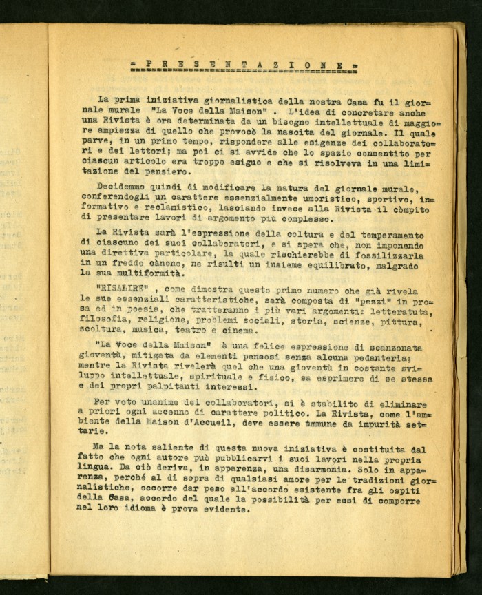 Si conserva materiale dattiloscritto e a stampa riguardante la Maison d'Accueil (poi Casa Nostra) di Rocca di Papa, casa di soggiorno diretta dal Meschieri per studenti universitari italiani e stranieri reduci dai campi di concentramento e dalle prigioni naziste e fasciste di Germania e Italia: