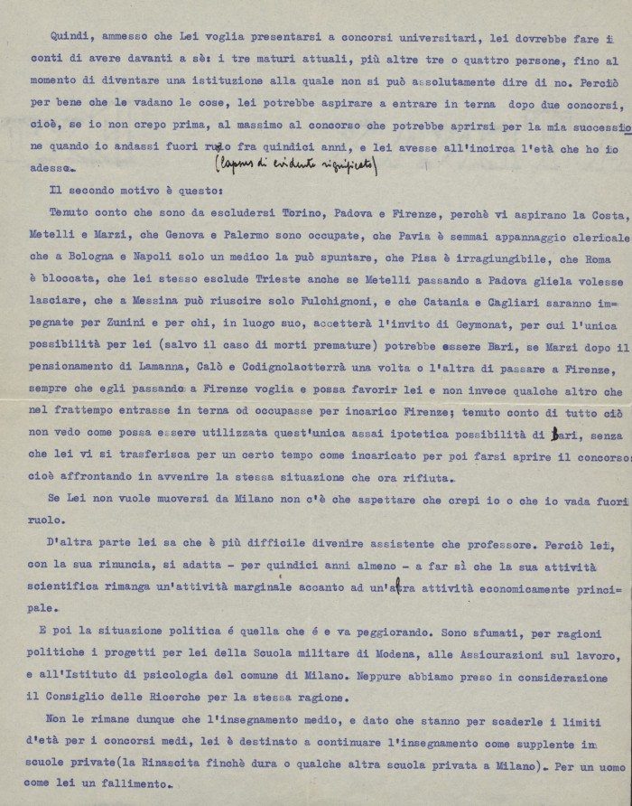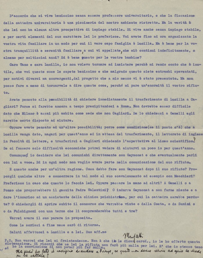 1) s.l., 22 agosto 1952: si dichiara molto dispiaciuto per la sua decisione di non trasferirsi all'Università di Cagliari, così da poter aspirare al ruolo di professore.