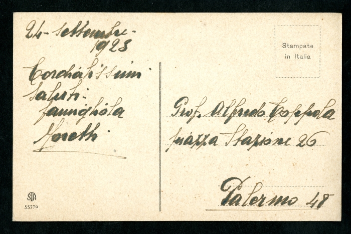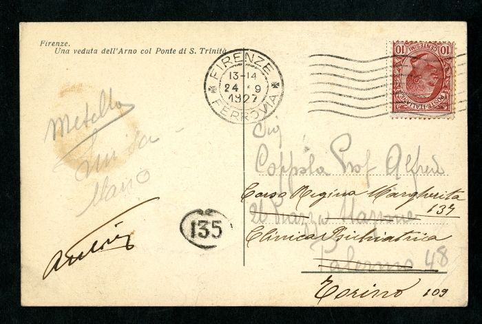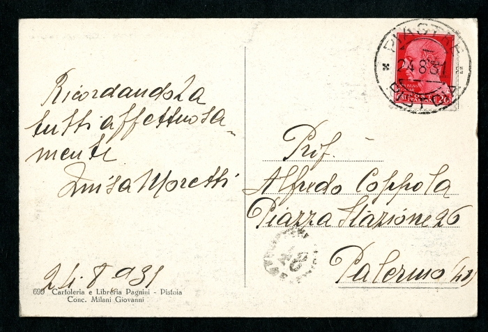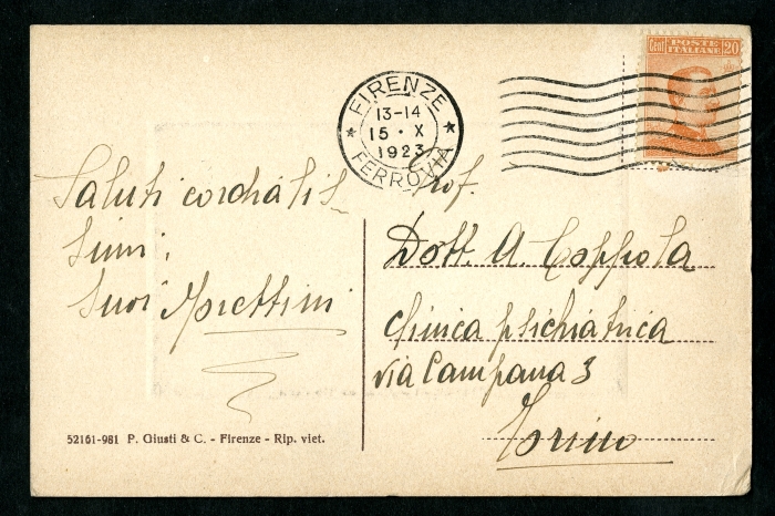 2) Castel Pulci, 24 settembre 1923: (firmato "famigliola Moretti") (la cartolina ritrae il manicomio di Castel Pulci);
