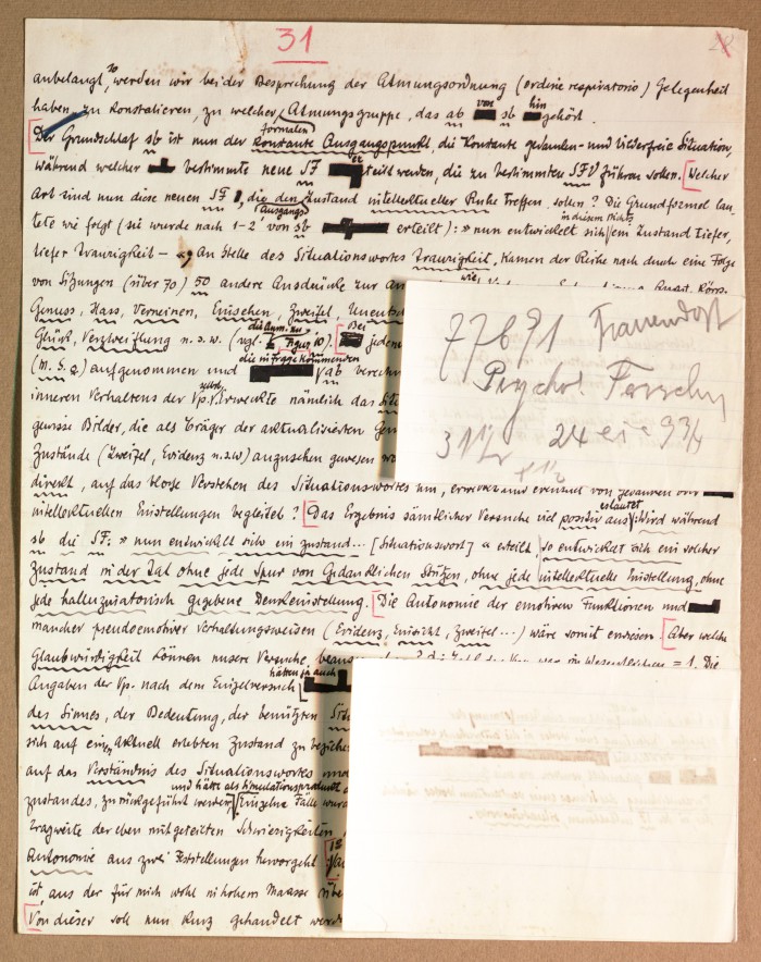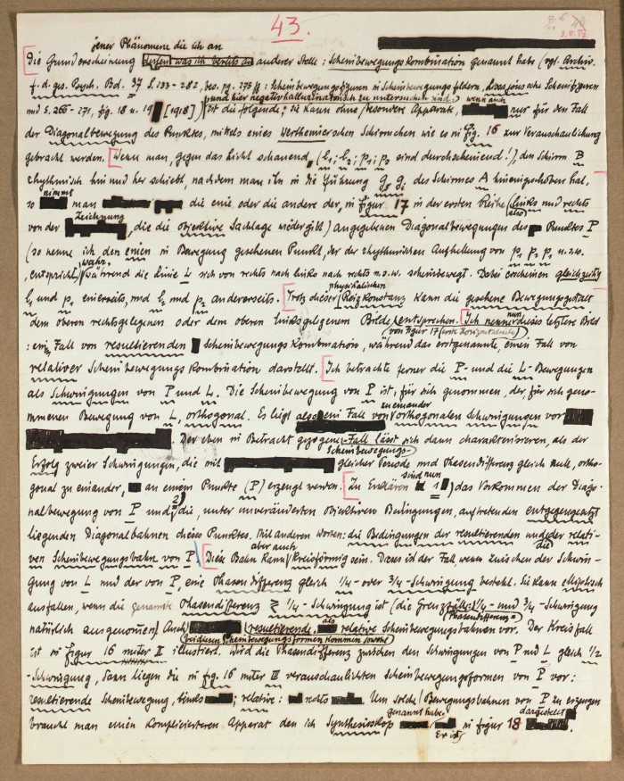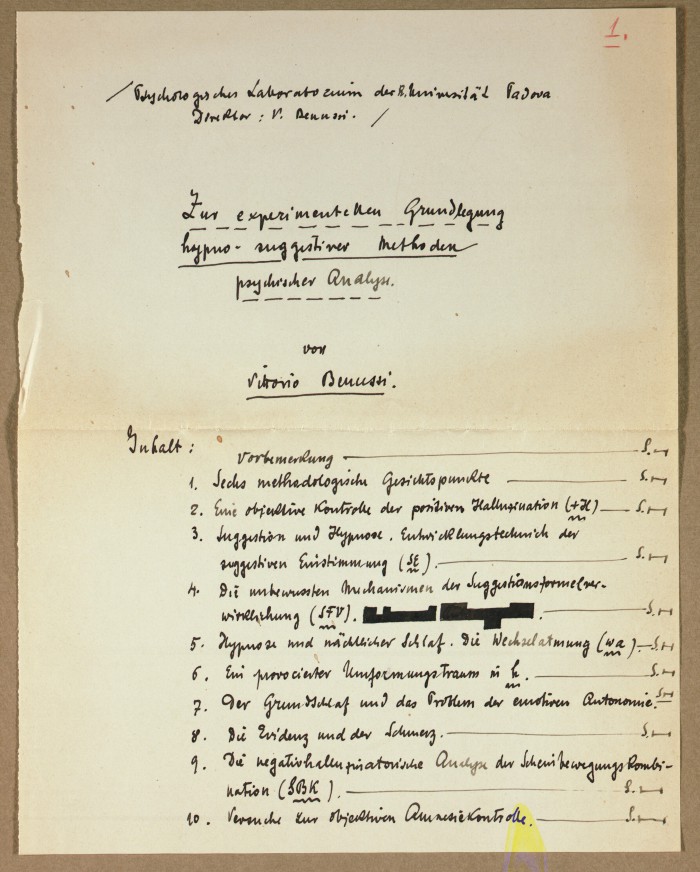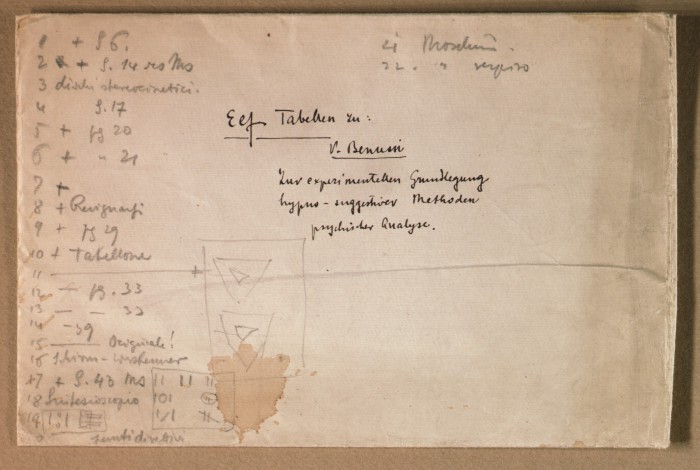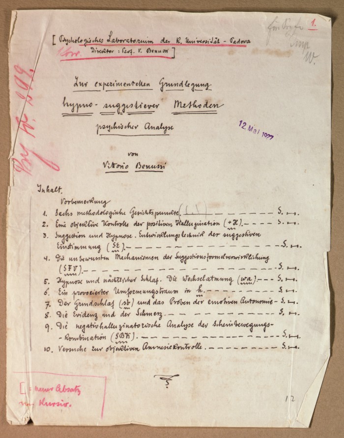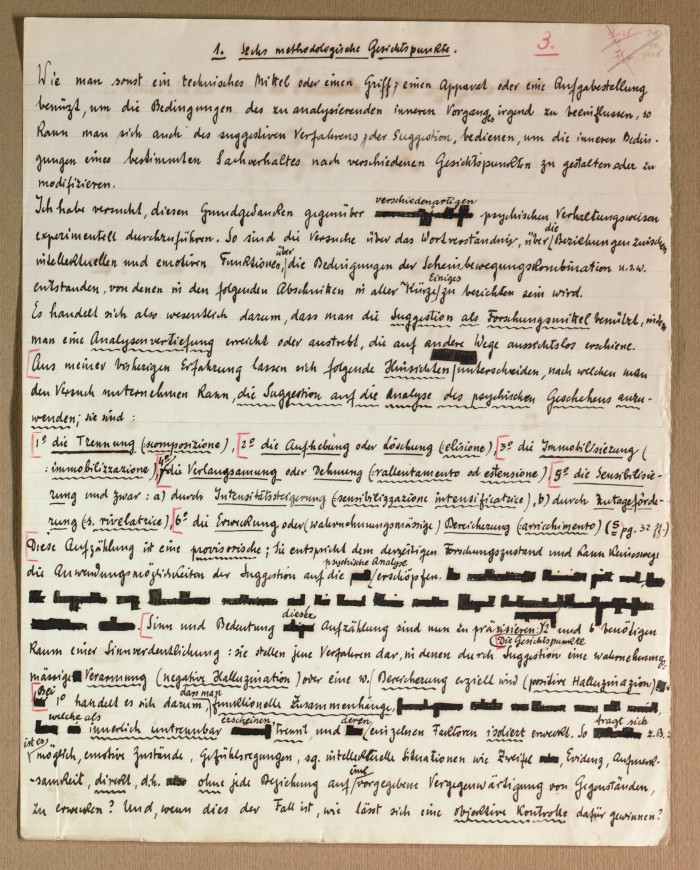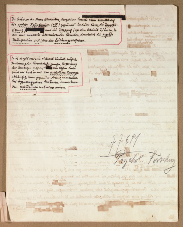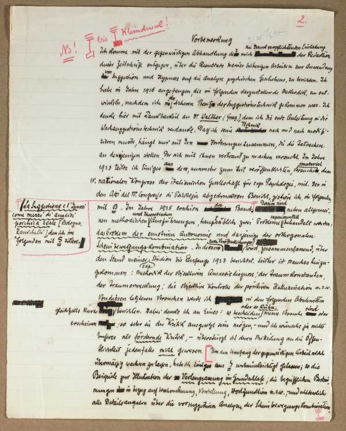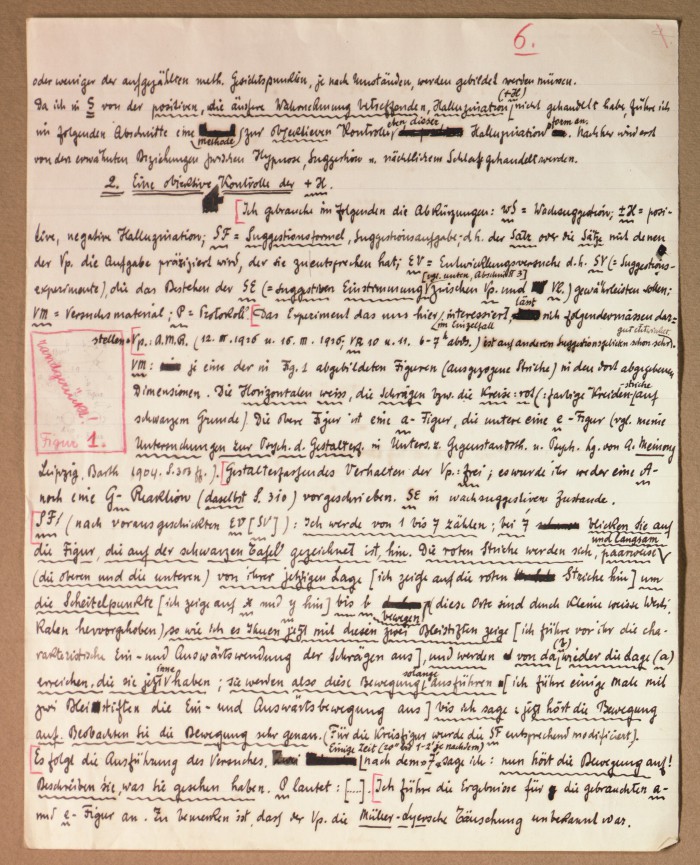 Il fascicolo contiene le bozze manoscritte di “Zur experimentellen Grundlegung hypno-suggestiever Methoden psychischer Analyse” (Fondamenti sperimentali di metodi ipno-suggestivi di analisi psichica), pubblicate in Psychologische Forschung, 9 (1927), 197-274.
