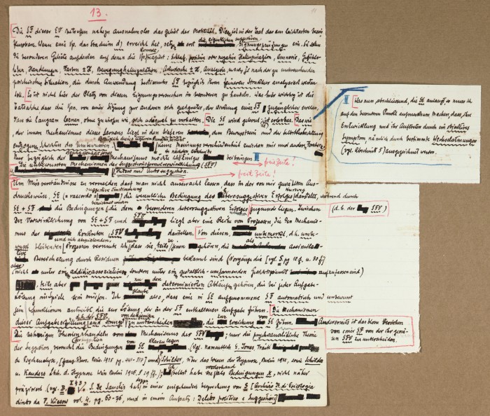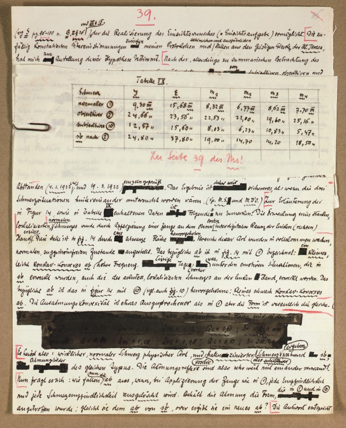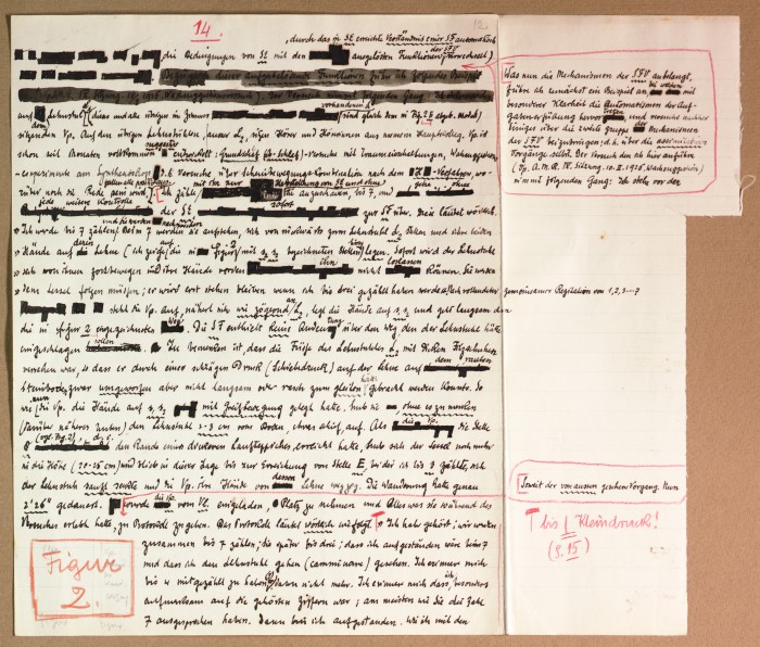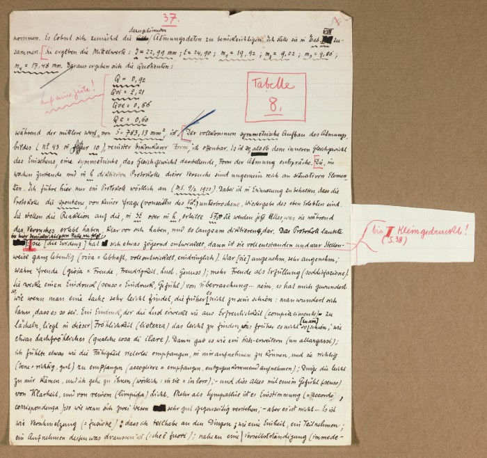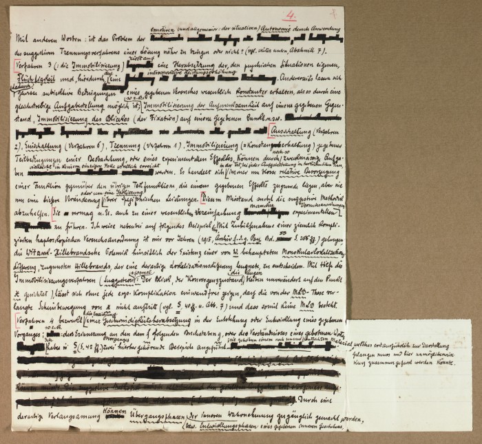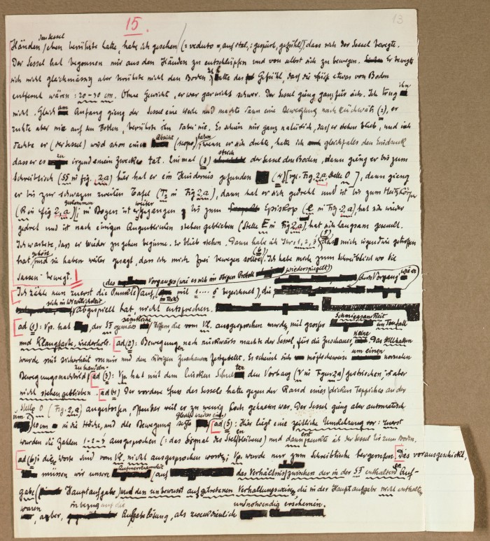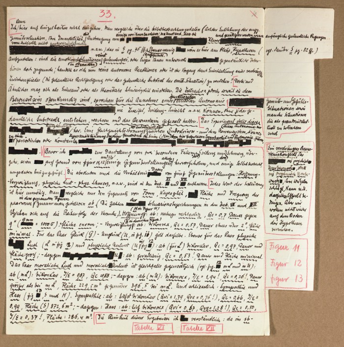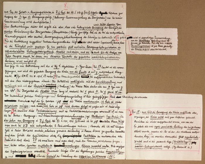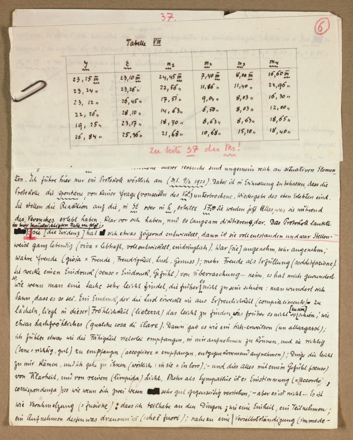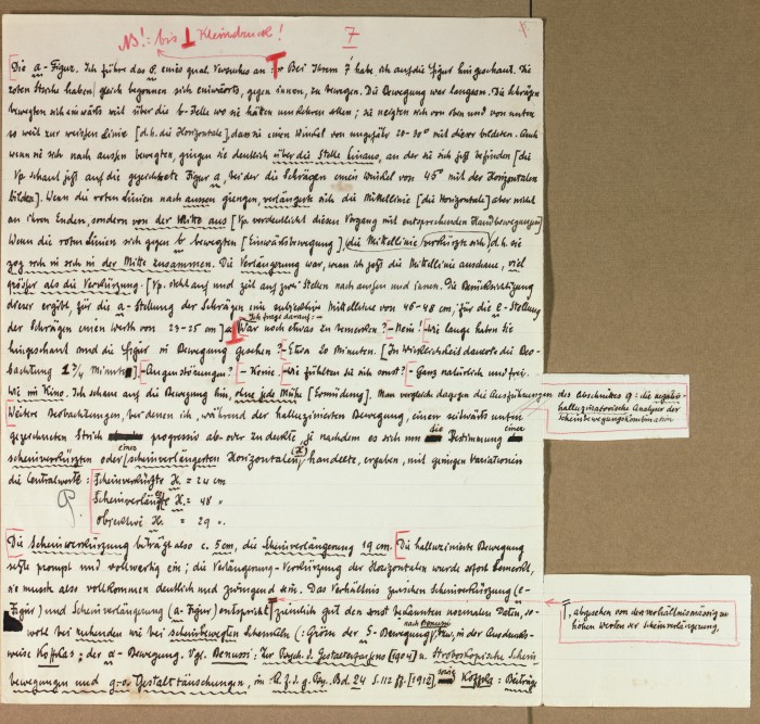 Il fascicolo contiene le bozze manoscritte di “Zur experimentellen Grundlegung hypno-suggestiever Methoden psychischer Analyse” (Fondamenti sperimentali di metodi ipno-suggestivi di analisi psichica), pubblicate in Psychologische Forschung, 9 (1927), 197-274.
