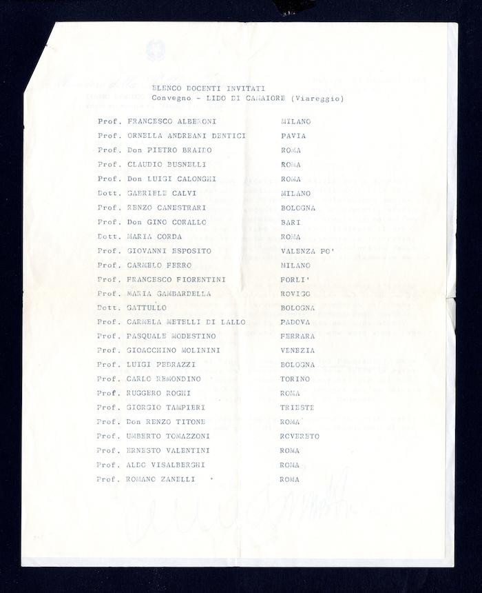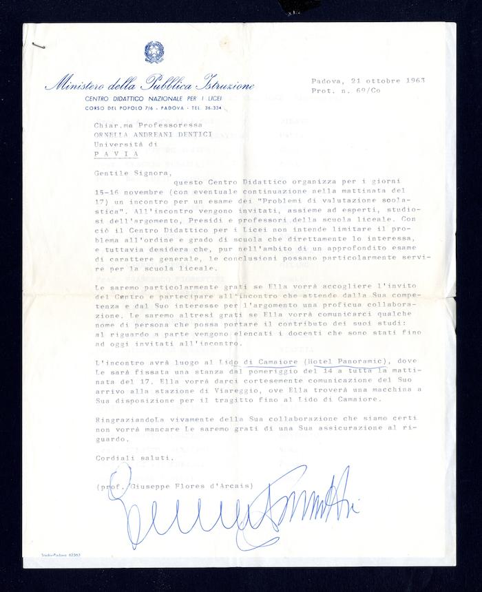 1) Padova, 21 ottobre 1963: Chiede a Dentici di partecipare come relatrice ad un incontro sul tema Problemi di valutazione scolastica, organizzato dal Centro didattico nazionale per i licei, che prevede la partecipazione di esperti e studiosi dell'argomento, presidi e professori della scuola liceale. Chiede inoltre a Dentici di indicare qualche collega che possa partecipare con un contributo proficuo. Il convegno avrà luogo a Lido di Camaiore dal 15 al 16 novembre 1963.
