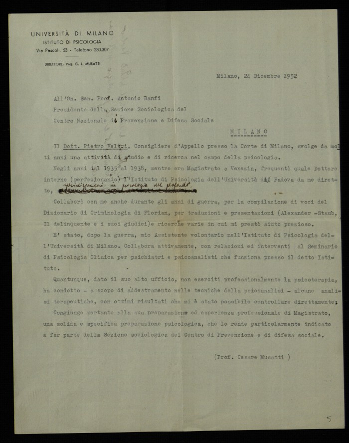 2) [s.l., 24 dicembre 1952]: propone Pietro Veltri per la candidatura a membro della Sezione Sociologica del Centro Nazionale di Prevenzione e Difesa Sociale. Della lettera sono presenti la versione manoscritta e dattiloscritta.