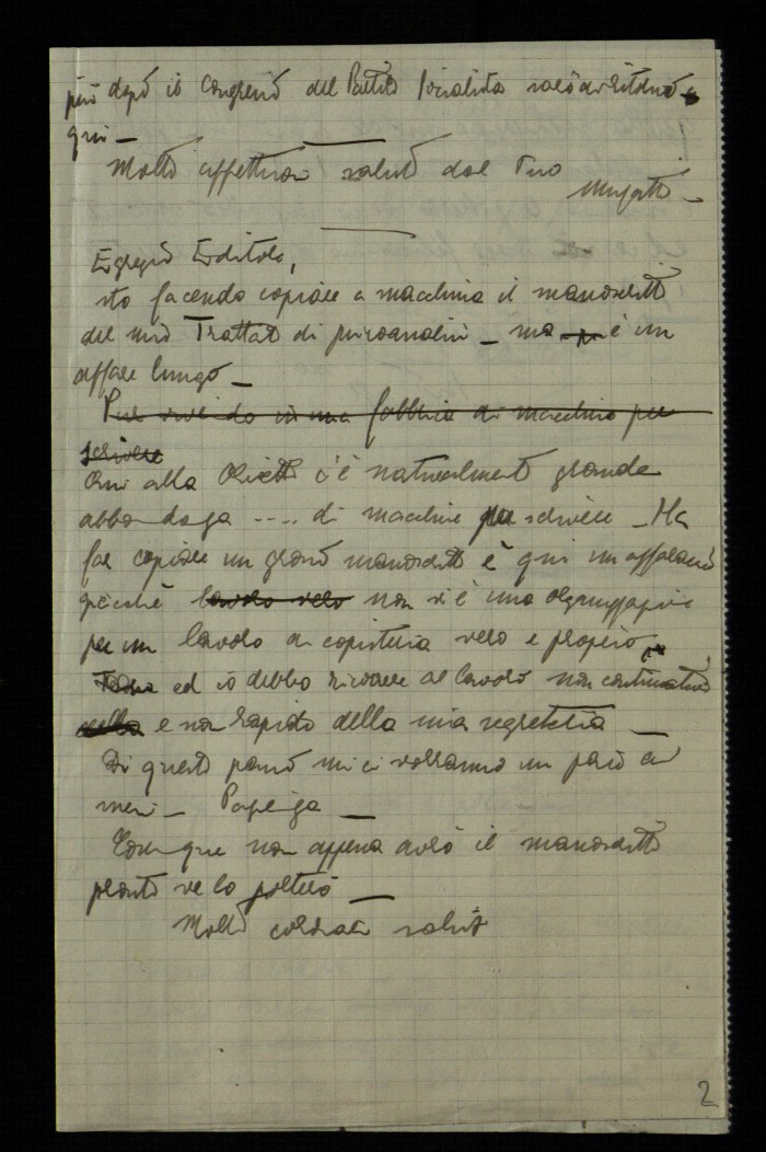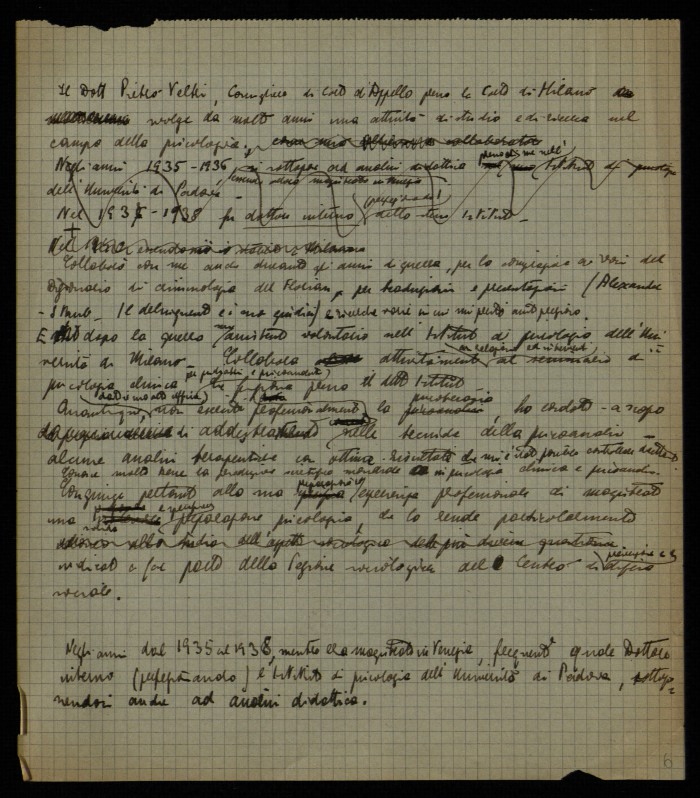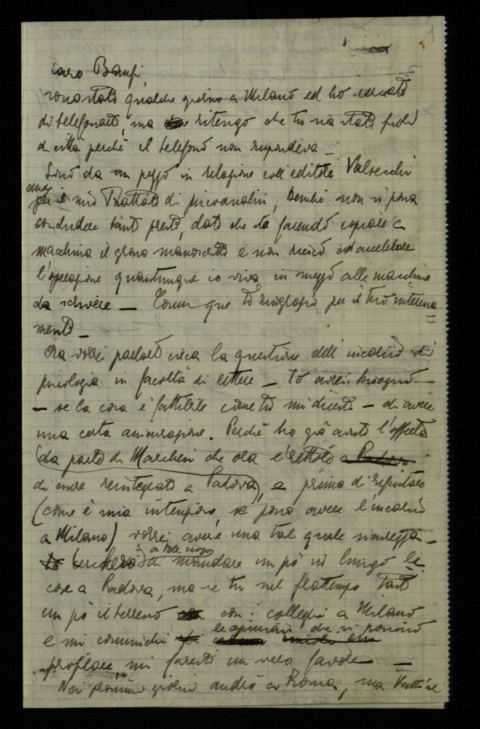 1) [s.l., post 1943]: chiede informazioni sulla possibilità di avere un incarico presso l'Università di Milano per l'insegnamento della Psicologia e riferisce che Concetto Marchesi, rettore dell'Università di Padova, gli ha appena offerto un incarico presso l'ateneo patavino (1). Nella carta si trovano anche: la minuta di una lettera all'editore Valsecchi in cui si informa sui tempi di consegna del dattiloscritto del "Trattato di Psicoanalisi"; la minuta di una lettera a Metelli in cui parla del suo prossimo viaggio a Roma e infine la minuta di una lettera a una signora a cui chiede ospitalità.
