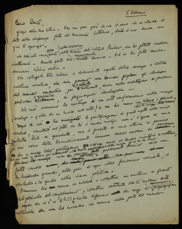 2) [Milano, 5 febbraio 1952]: comunica di non voler dare la trascrizione della conferenza tenuta all'Università Cattolica di Milano sulla psicologia e la scienza in Unione Sovietica, e ne riassume sinteticamente il contenuto (1).