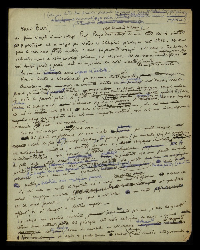 1) [Milano, 1952]: si indigna per non essere stato incluso nella delegazione degli psicologi italiani scelti per partecipare al viaggio in Unione Sovietica e avanza una lettura politica della sua mancata convocazione.