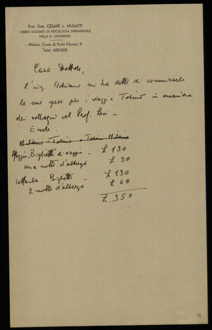 3) [Milano, 194647]: comunica le spese di viaggio a Torino in occasione dei colloqui col prof. Levi, dietro invito di Adriano Olivetti (2).