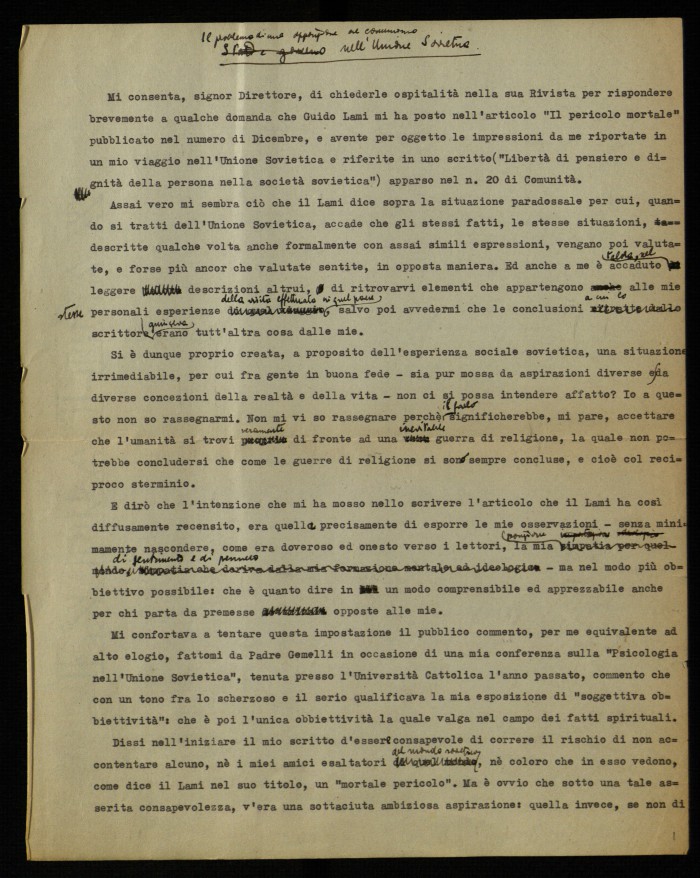 Lettera aperta intitolata "Il problema di una opposizione al comunismo nell'Unione Sovietica", inviata al Direttore della rivista Studium affinché fosse pubblicata. La lettera intende essere una risposta all'articolo di Guido Lami, "Il pericolo mortale", apparso nel numero di dicembre della stessa rivista, e contenente osservazioni critiche in merito al saggio di Musatti, "Libertà di pensiero e dignità della persona nella società sovietica", pubblicato nel settembre 1953 sul n. 20 della rivista "Comunità". Nella lettera aperta Musatti rivendica l'obiettività del suo saggio apparso su "Comunità", riguardante le impressioni riportate dal viaggio in Unione Sovietica del novembre-dicembre 1952, e precisa la sua posizione in merito al problema dell'opposizione politica al comunismo in tale paese (1).