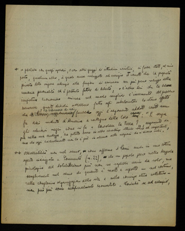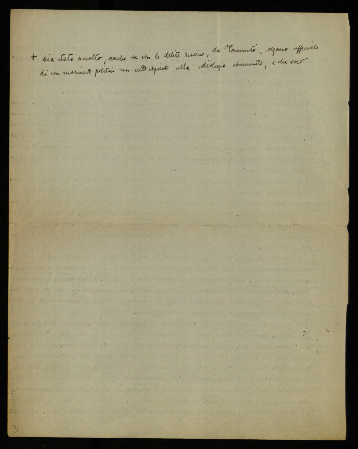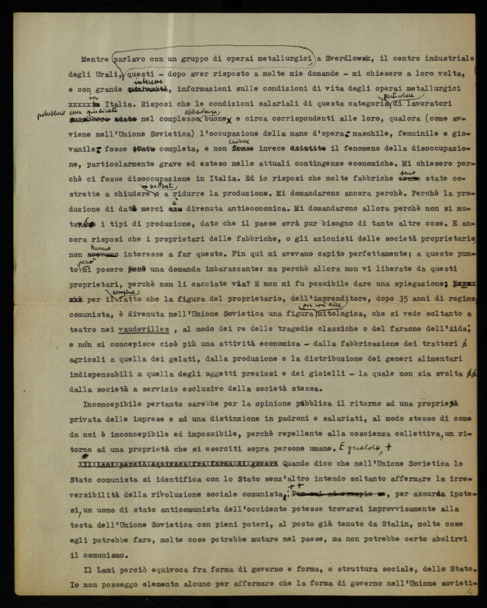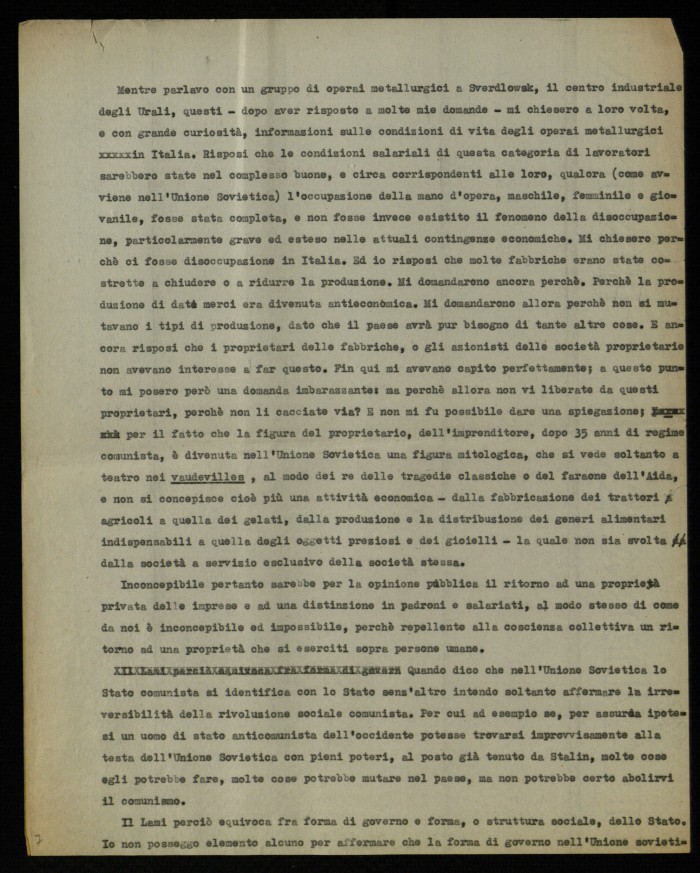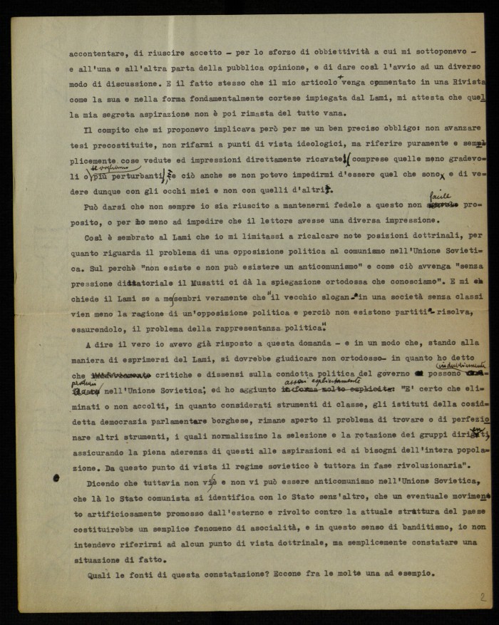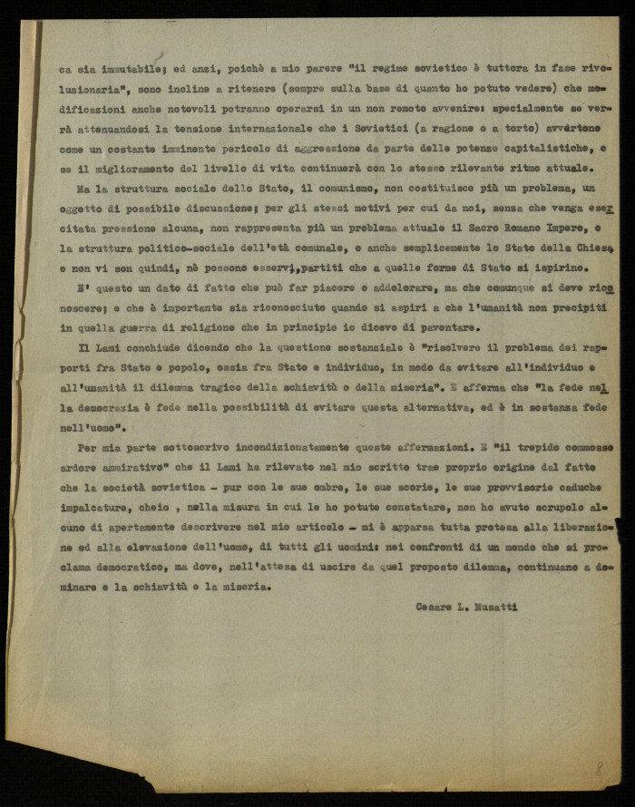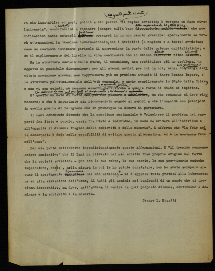 (1) "Studium. Rivista mensile di vita e cultura", edita a Roma presso le edizioni Studium e diretta da Giovanni Battista Scaglia. La lettera aperta di Musatti, dal titolo "Sul problema di una opposizione al comunismo in Unione Sovietica", fu pubblicata nel fasc. 3 del 1954, alle pp. 171-175. La lettera era seguita da una ricca e argomentata replica di Guido Lami (pp. 175178). La polemica tra Musatti e Lami fu ripresa nei numeri successvi della rivista, grazie agli interventi di Modestino Manfra ("Ancora a proposito del problema di una opposizione al comunismo nell'Unione Sovietica", in "Studium", fasc. 4, 1954, pp. 256-257) e di Luigi Gui ("Sempre a proposito di una opposizione al comunismo nell'Unione Sovietica", in "Studium", fasc. 5, pp. 333-337). La lettera di Musatti, dattiloscritta, contiene molte correzioni manoscritte; le ultime due carte sono una copia della parte finale della lettera.