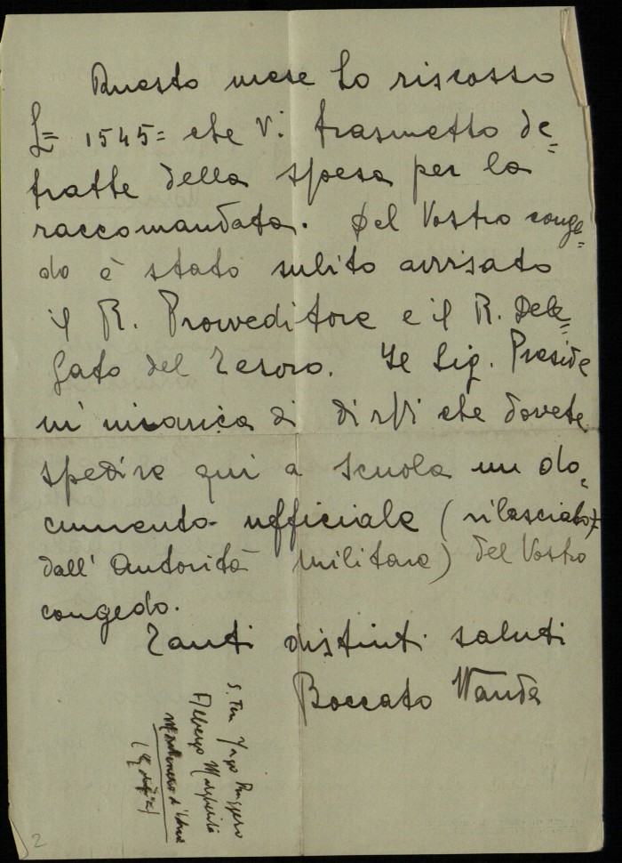 1) Vittorio Veneto, 28 agosto 1940: si congratula per il congedo militare ottenuto e gli chiede di spedire al riguardo un documento ufficiale, rilasciato dall'autorità militare; alla lettera acclude un assegno di £ 1543,25.