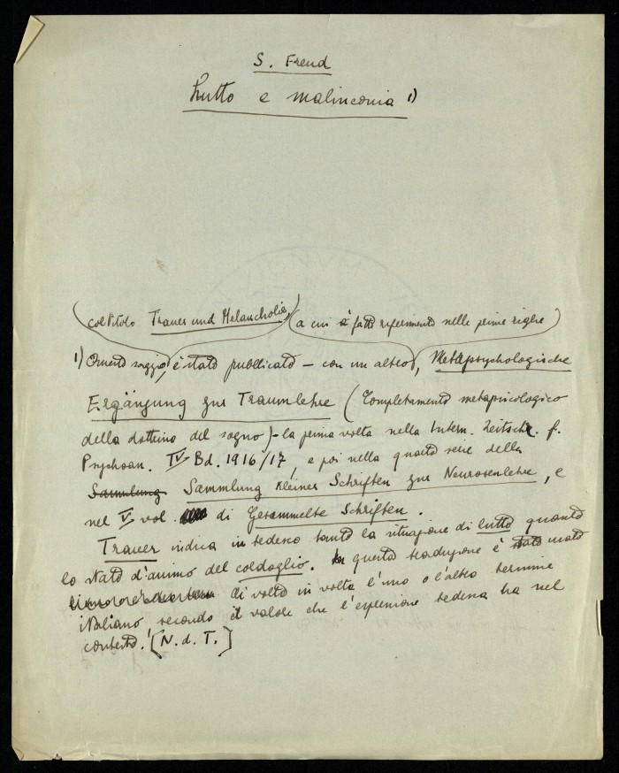 Nota alla traduzione di "Lutto e malinconia" di Sigmund Freud, apparsa in "Rivista di Psicoanalisi", 1955, 13, pp. 315, a cura di E. Molinari.
